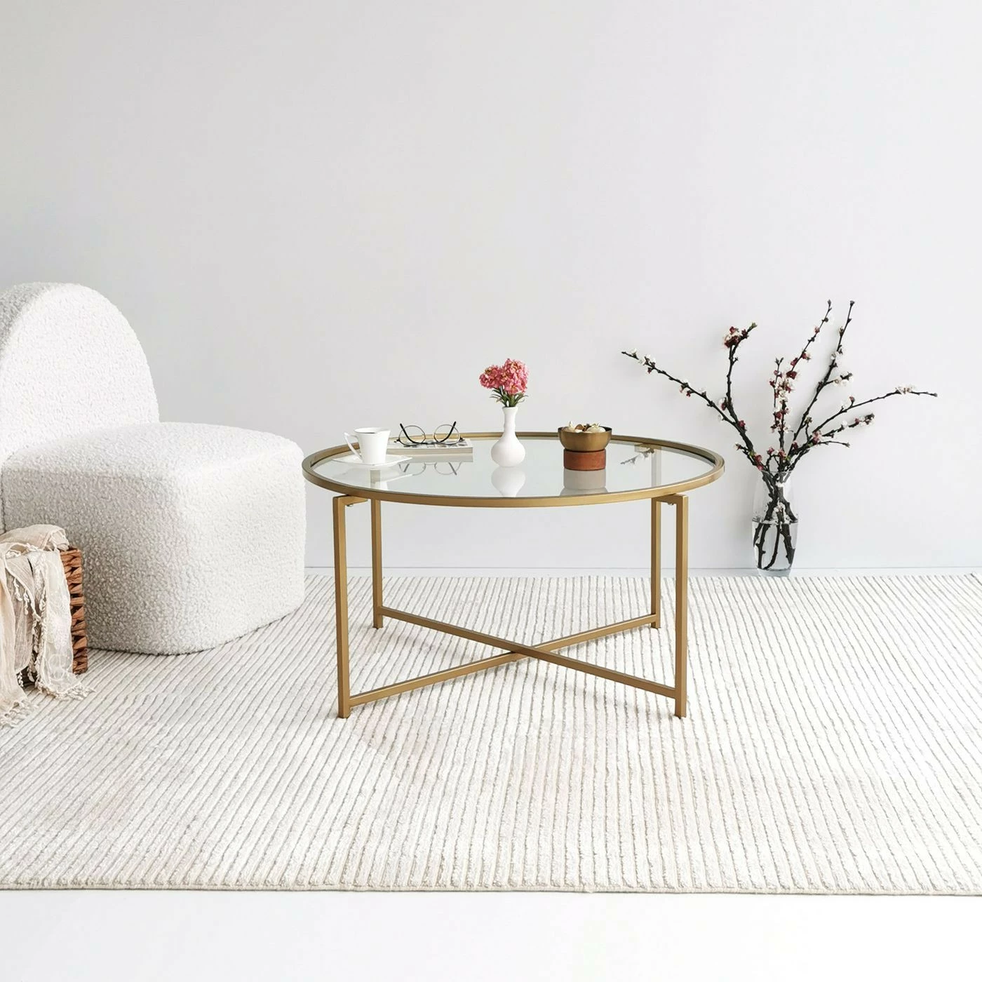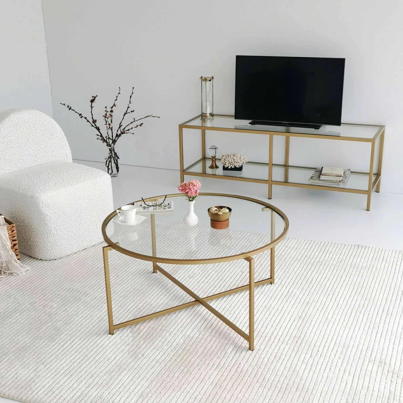 Pyöreä Gold Sun -sohvapöytä, jossa on kullanvärinen metallirunko ja kirkas lasikansi.
