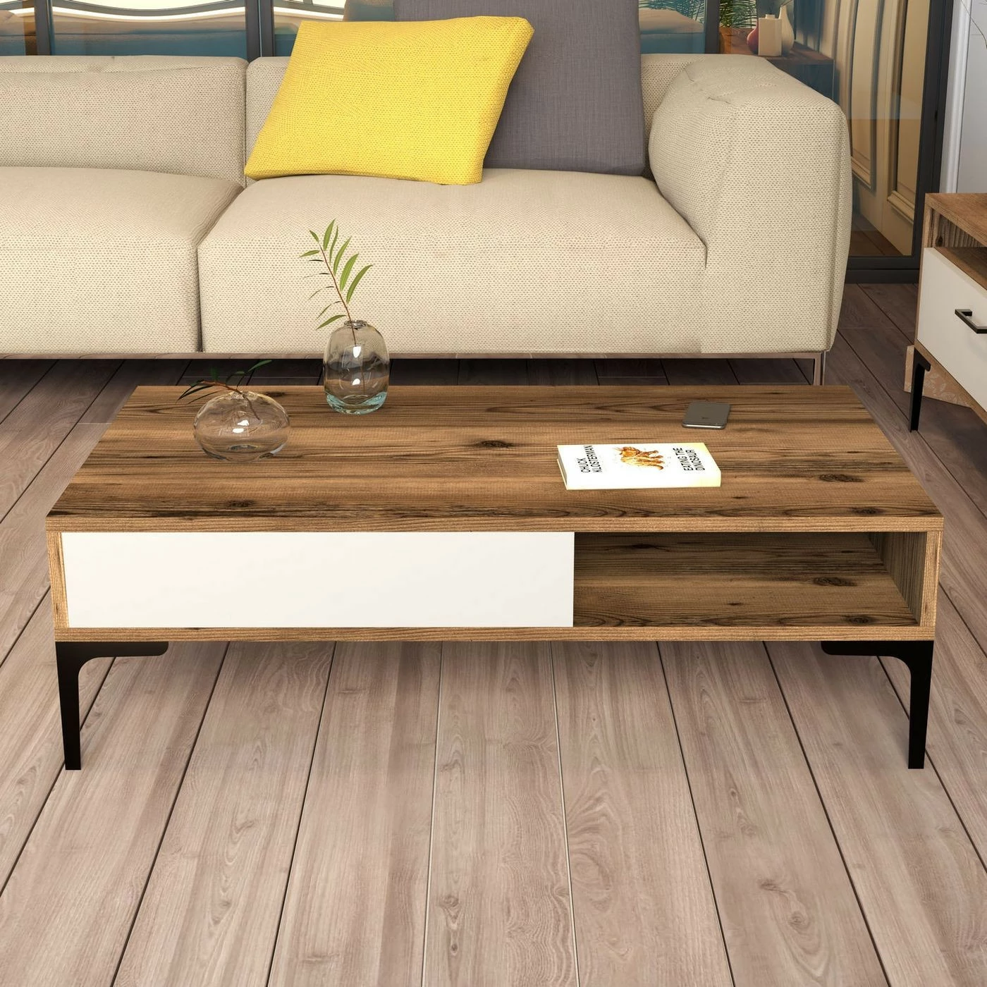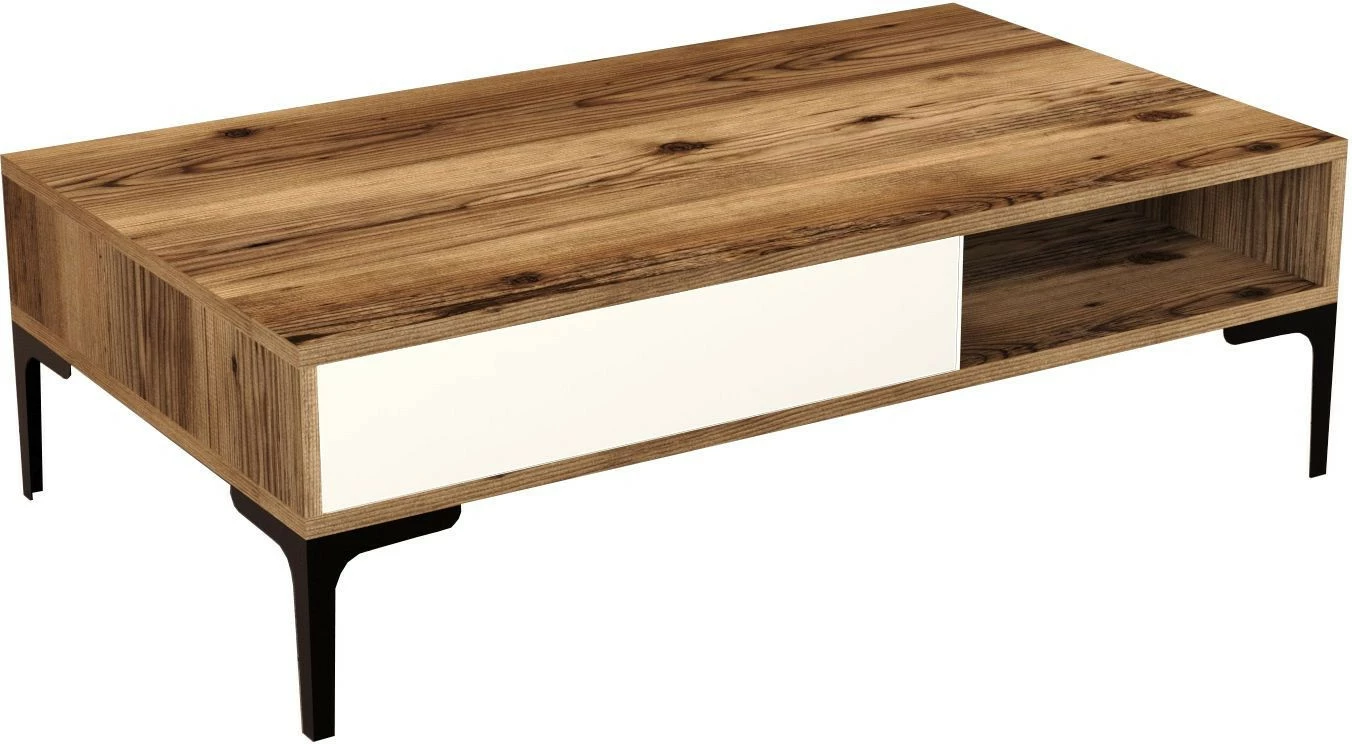 Linento Furnituren Istanbul-sohvapöytä. Hyllyosan tehosteväri tuo kivaa twistiä puunväriseen pöytään. Jalat ovat metallia.