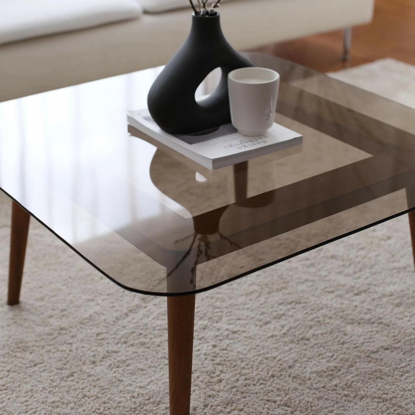 Pronssinvärinen Smart-lasipöytä, jonka jalat ovat puuta.