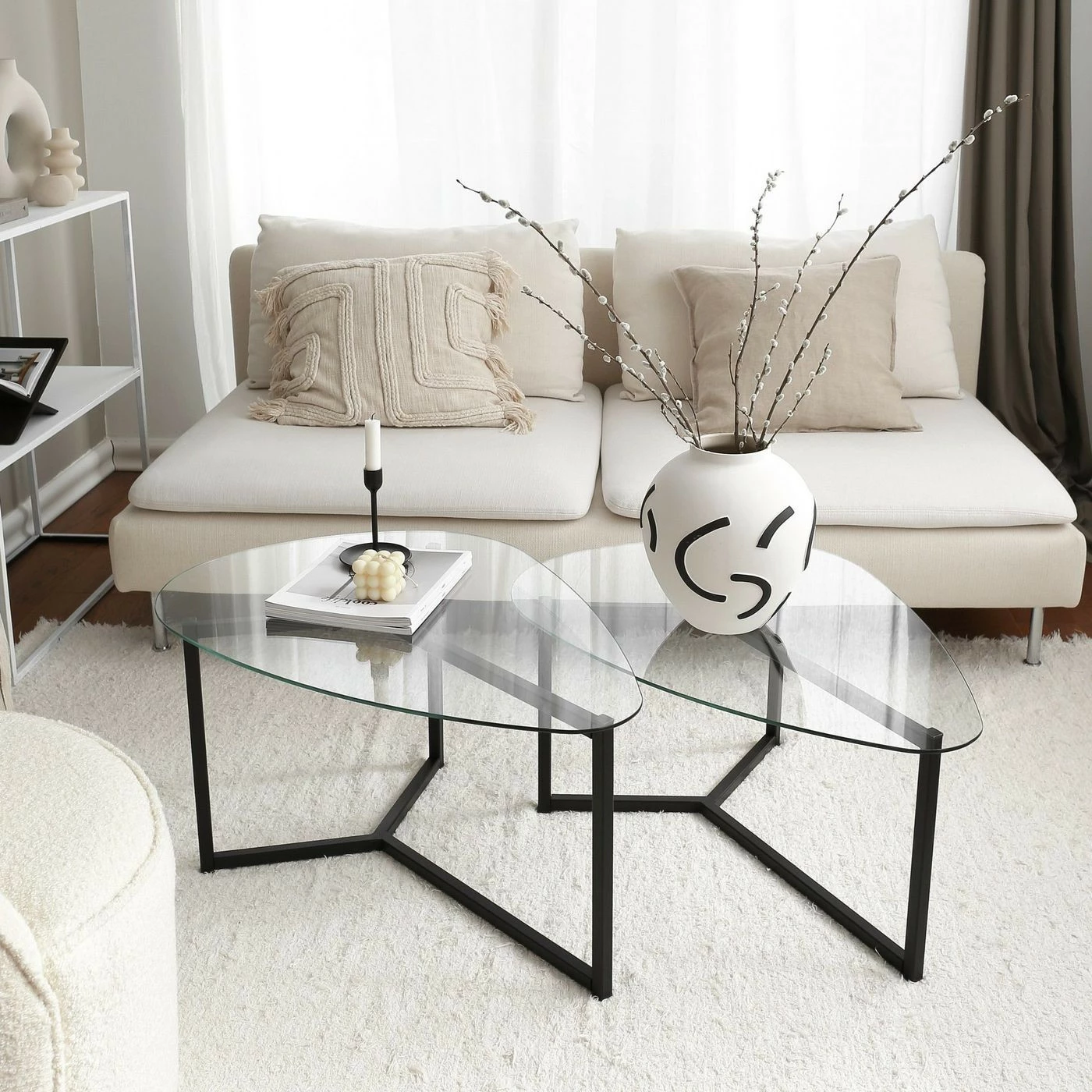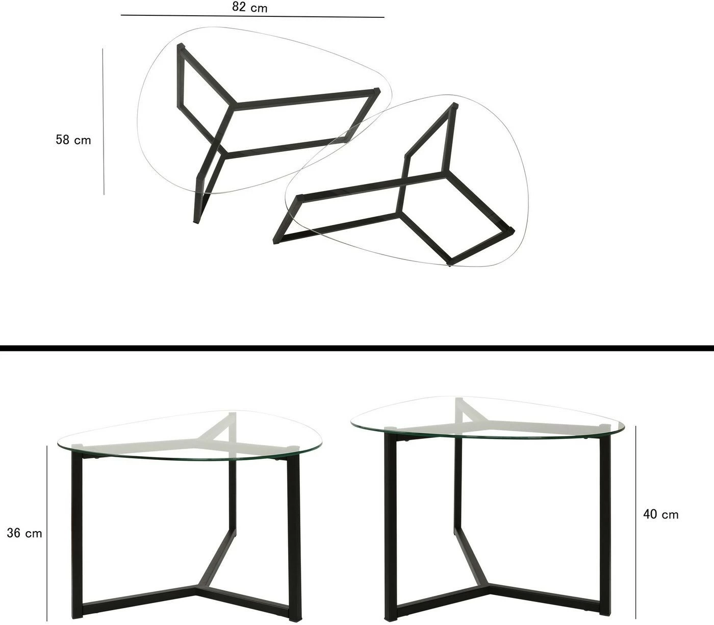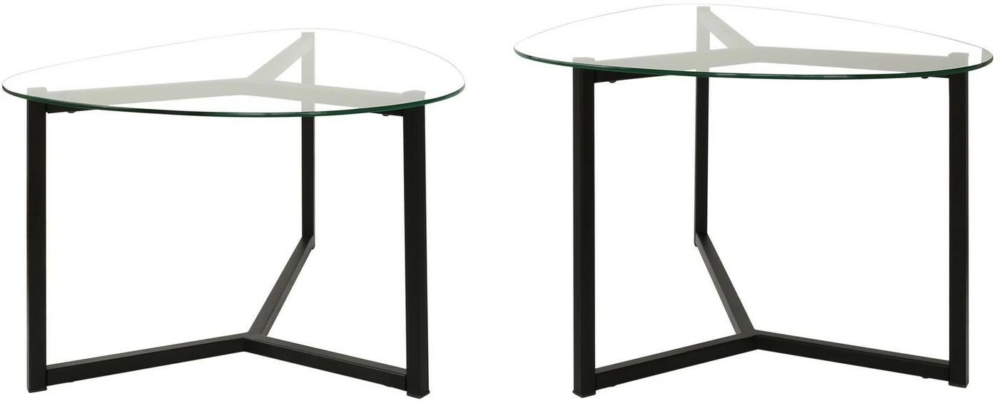 Kaksiosainen Bellisimo-sohvapöytäsetti. Runko metallia, pöytälevy karkaistua lasia.