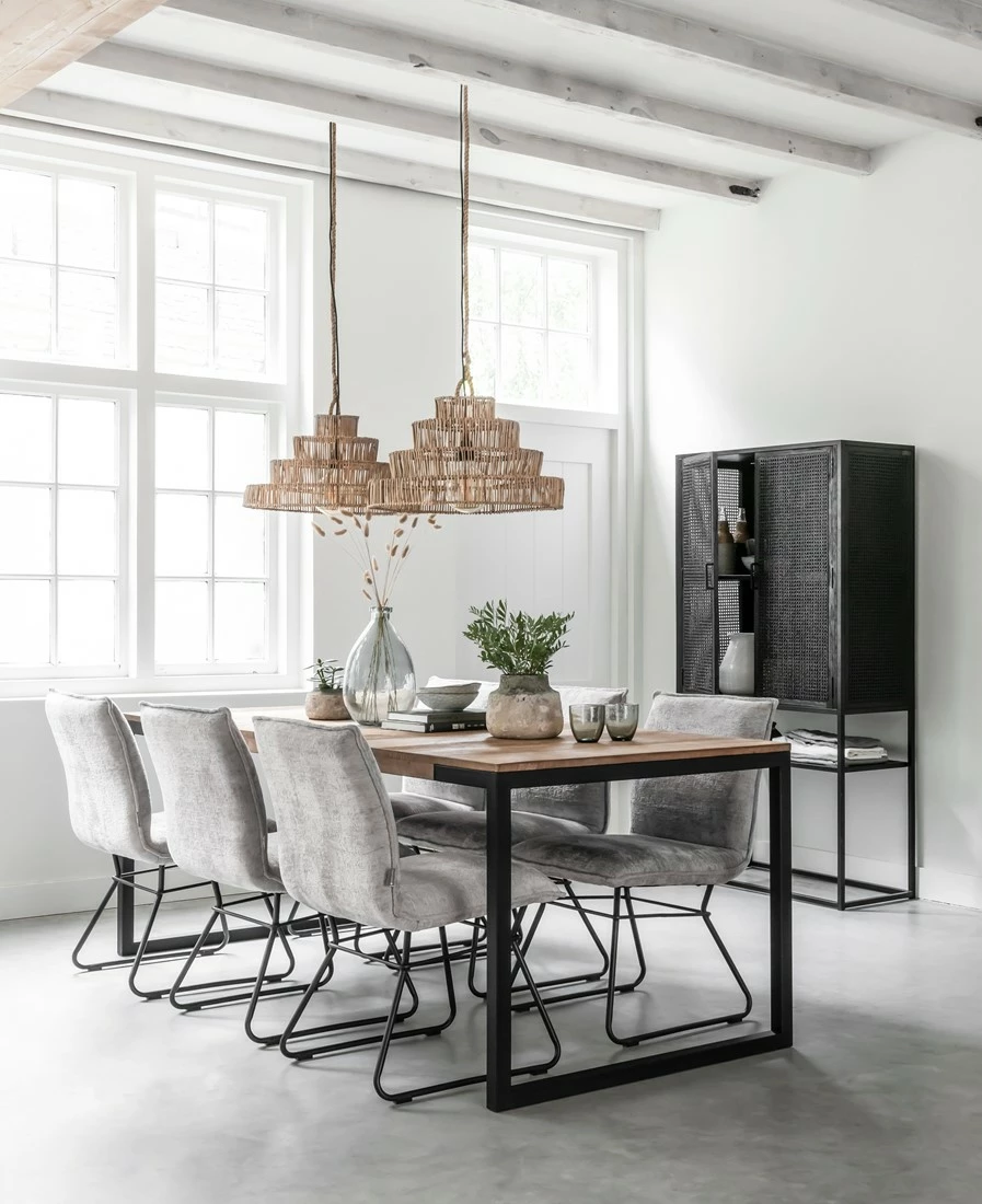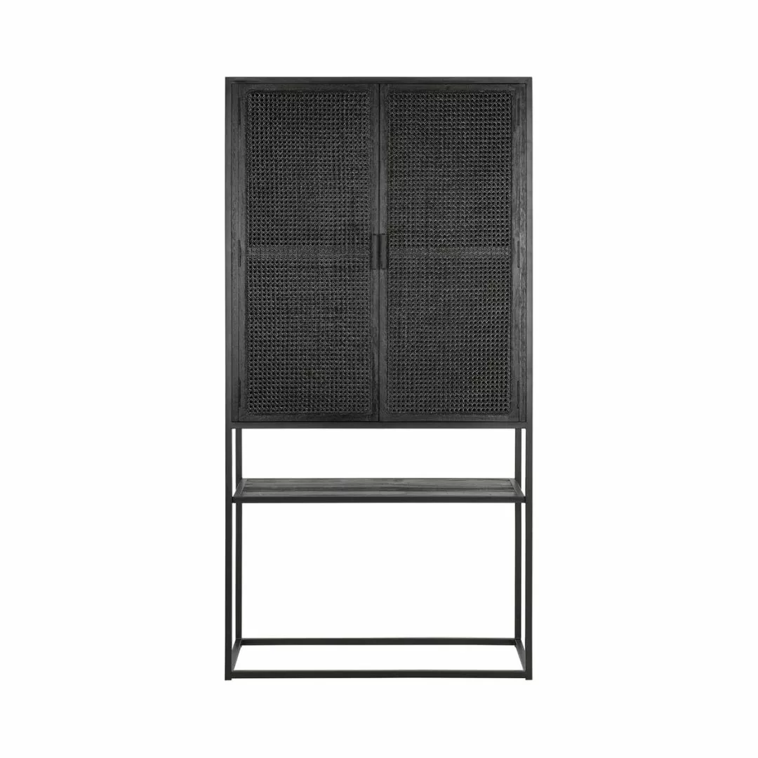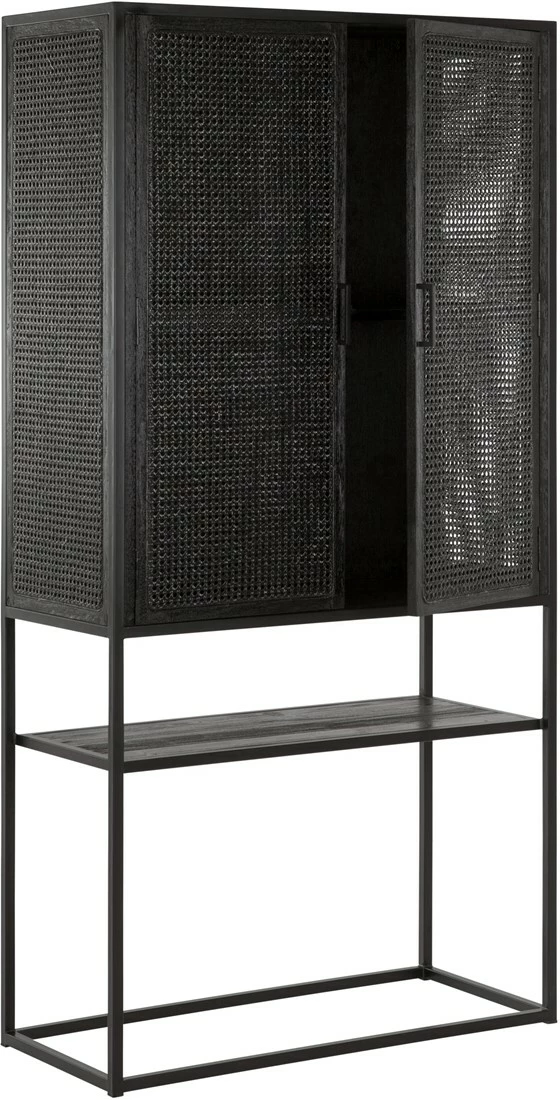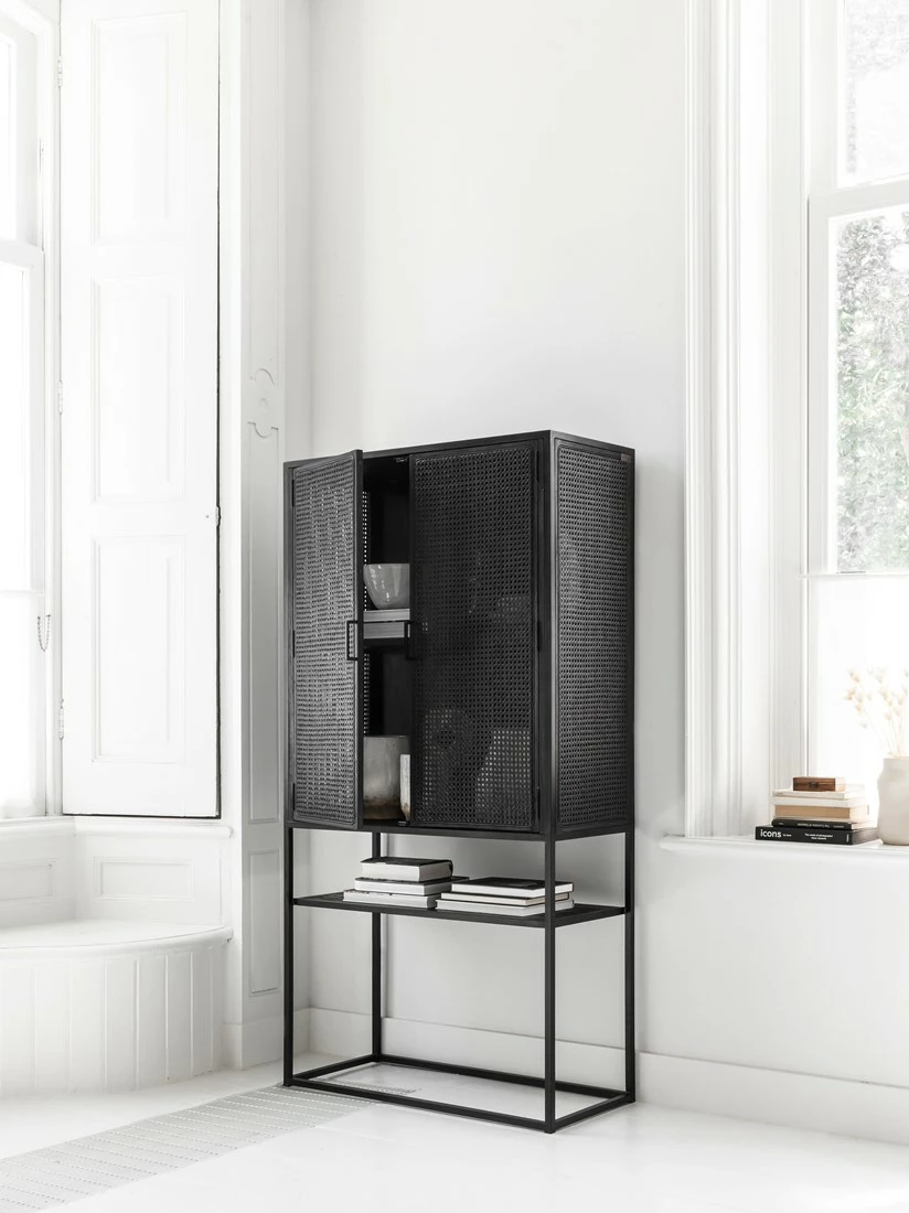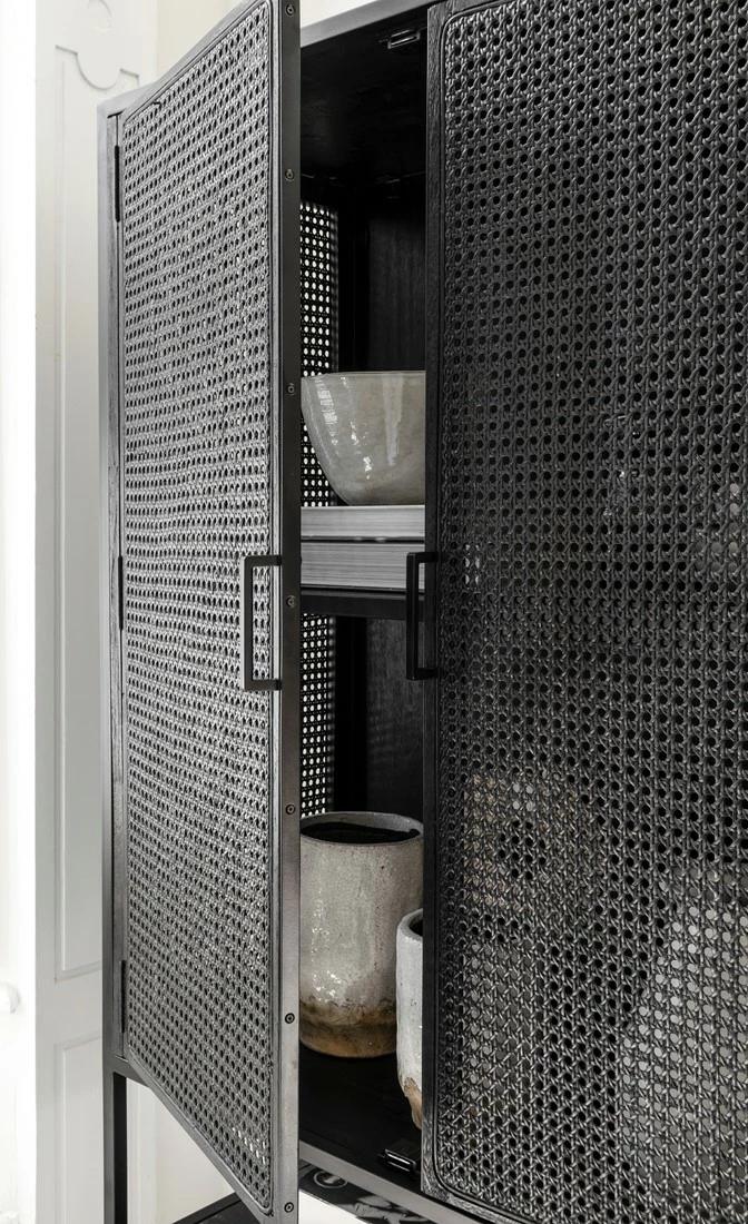Upean näyttävä musta rottinkikaappi on ripauksen loft-henkinen kaappi kuitenkin lämpimällä tavalla. Laadukas rottinkipunos kestää niin katsetta kuin käyttöäkin ja sisäosien täyspuuhyllyille voit pinota myös astiat kuin muutakin painavaa halutessasi. Täydellinen kaappi, jos toivot kauniit käyttöesineesi suojaan pölyltä, mutta kuitenkin näkösälle. Yksi avoin hyllytaso ja sivuille aukeavien tuplaovien takana on lisää hyllytasoja. Kätevä ilmava säilytyskaluste eteiseen, ruokailutilaan tai olohuoneeseen. Jotain erilaista tyylillä!