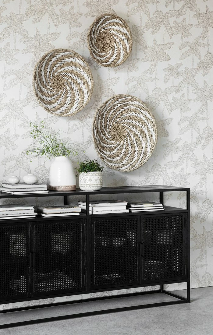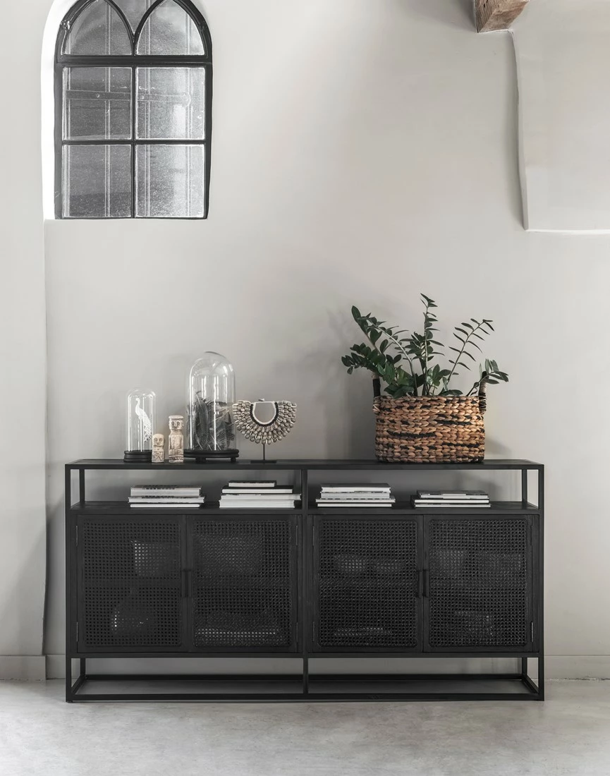 Upean näyttävä musta rottinkisenkki on ripauksen loft-henkinen kaappi kuitenkin lämpimällä tavalla kodikas. Laadukas rottinkipunos kestää niin katsetta kuin käyttöäkin ja sisäosien täyspuuhyllyille voit pinota niin astiat kuin muutakin painavaa halutessasi. Täydellinen kaappi, jos toivot kauniit käyttöesineesi suojaan pölyltä, mutta kuitenkin hieman näkösälle. Yksi avoin hyllytaso yläpinnan alla keventää tyylikkästi ison kalusteen tyyliä. Käytännöllinen ja kestävä säilytyskaluste eteiseen, ruokailutilaan tai olohuoneeseen. Jotain erilaista tyylillä!