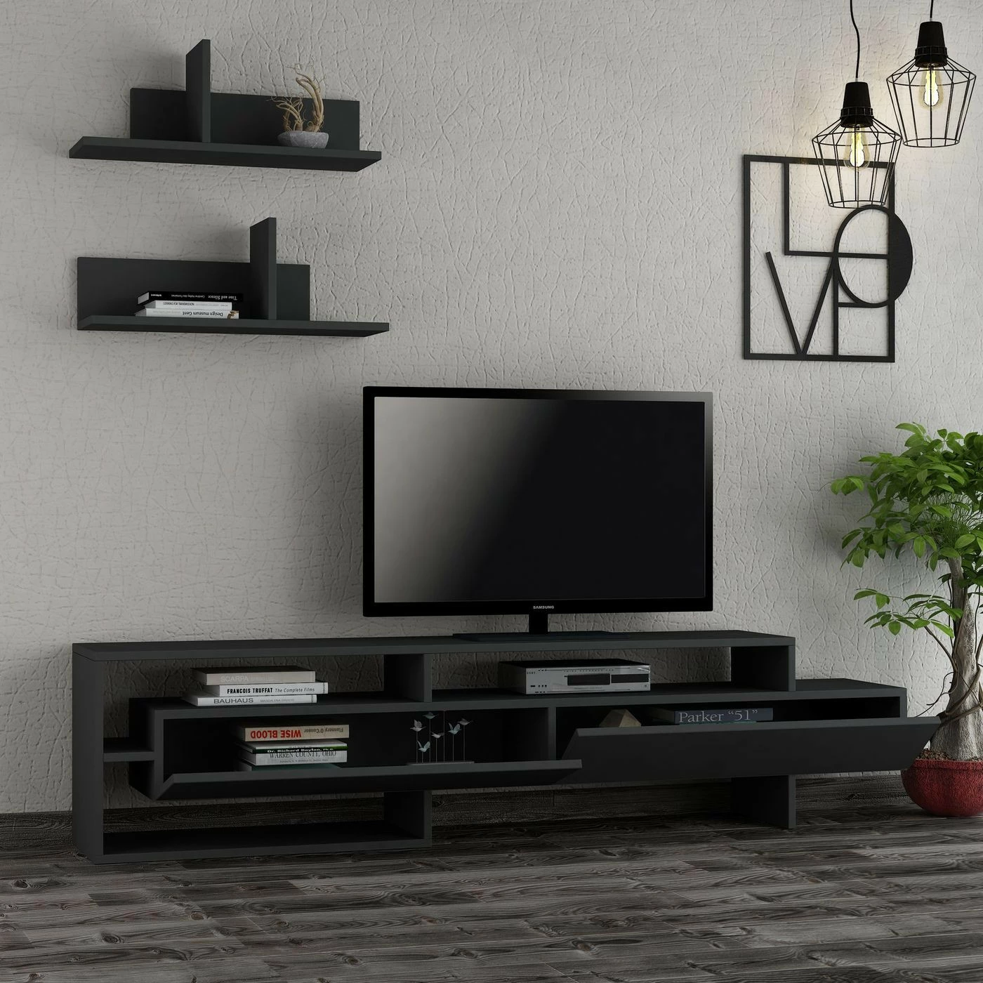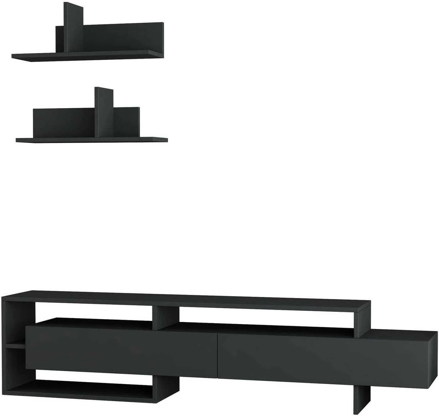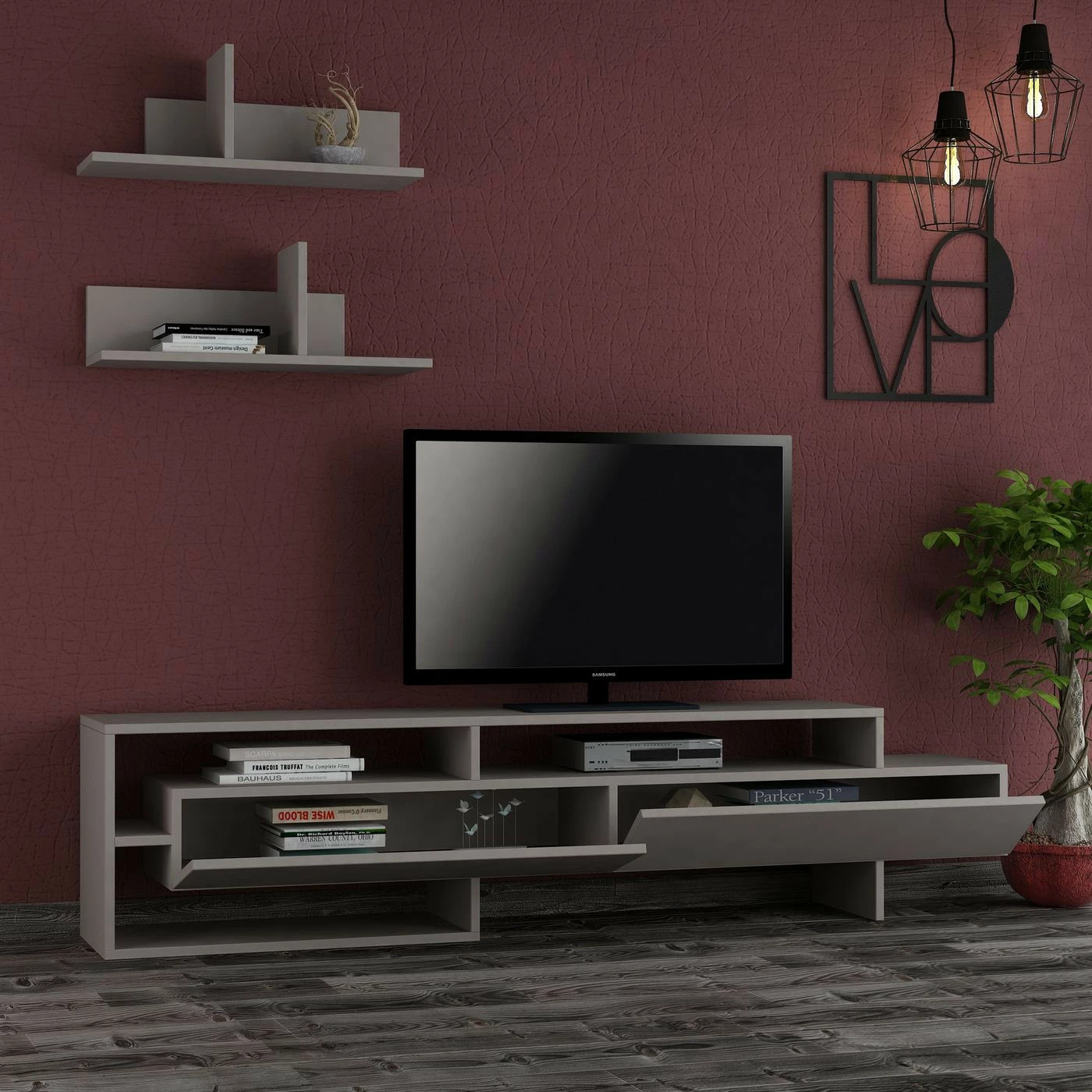 Gara-TV-tasossa on hauska muotoilu. Muotokieli jatkuu kahdessa seinään kiinnitettävässä hyllyssä, jotka voit sommitella haluamallasi tavalla.
