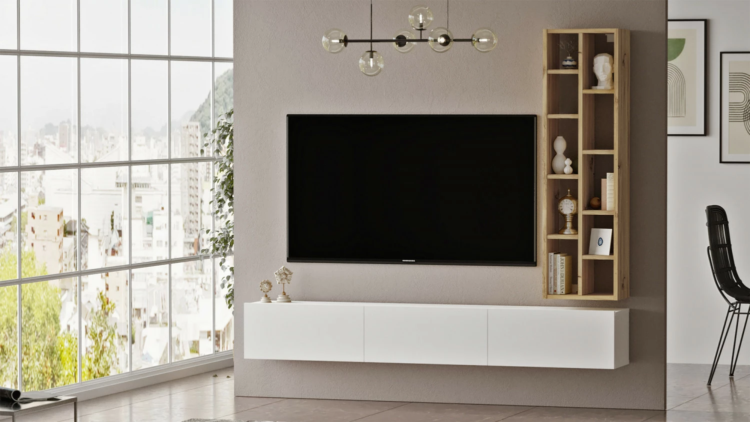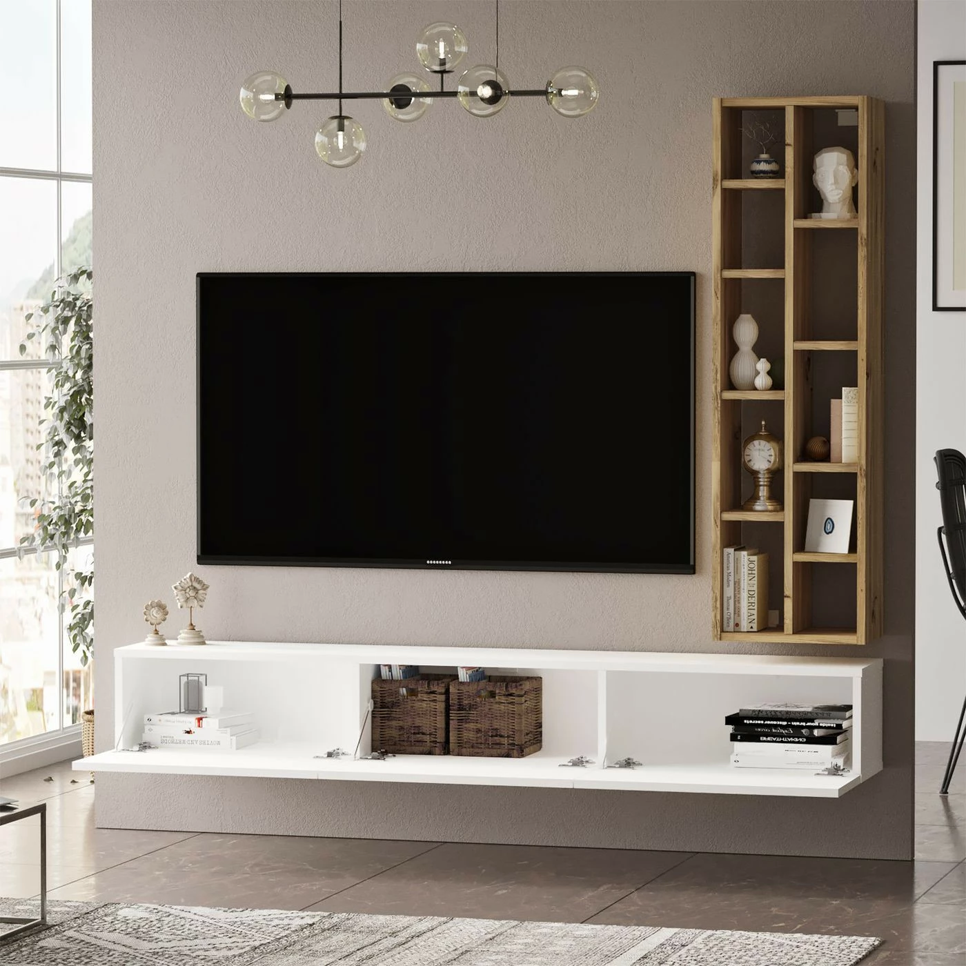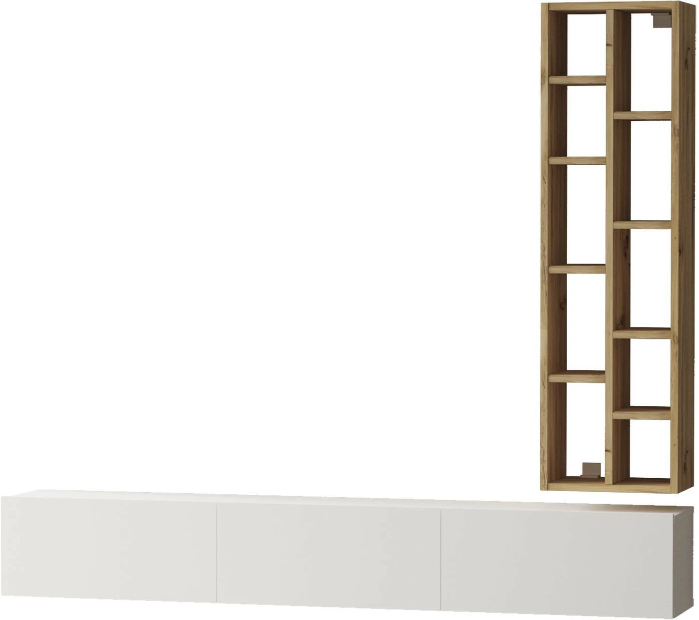 Valkoisen TV-tason mukana toimitetaan tammenruskea, seinään kiinnitettävä kirjahylly. Sommittele haluamallasi tavalla.