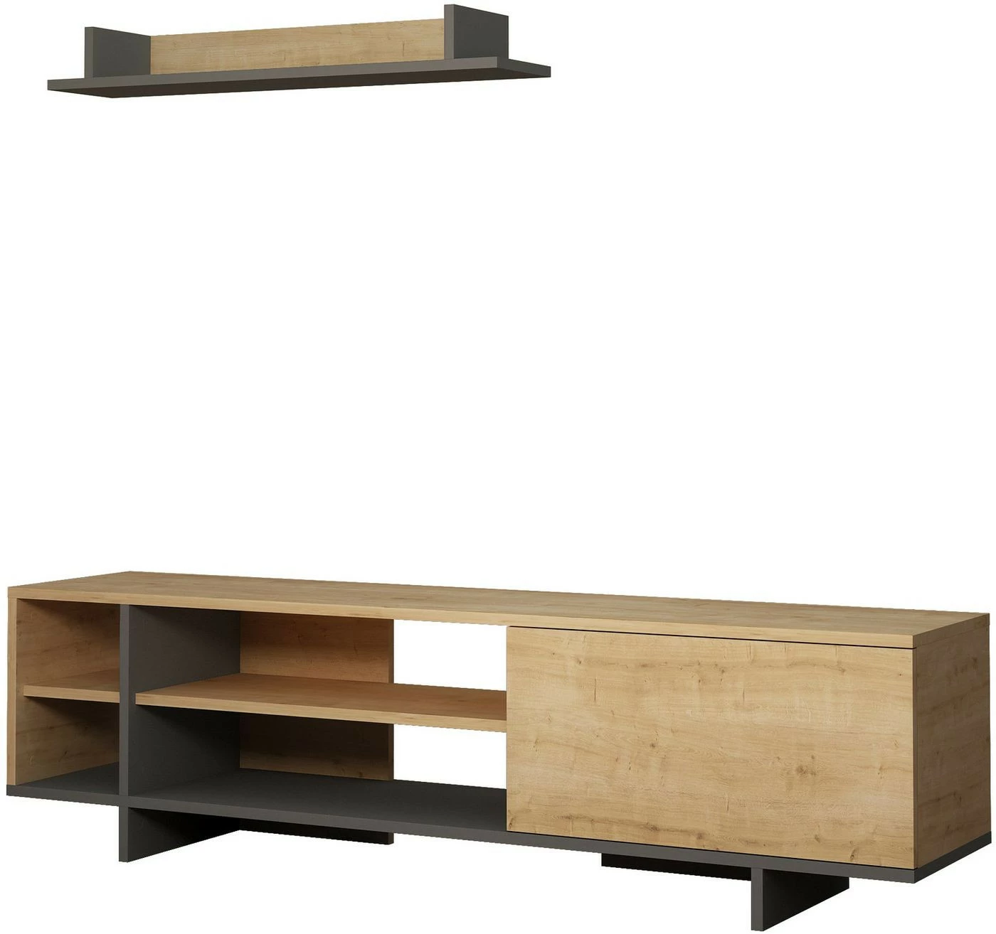 Kaksivärinen Stockton-TV-taso. Erillinen seinähylly viimeistelee kauniin kokonaisuuden.