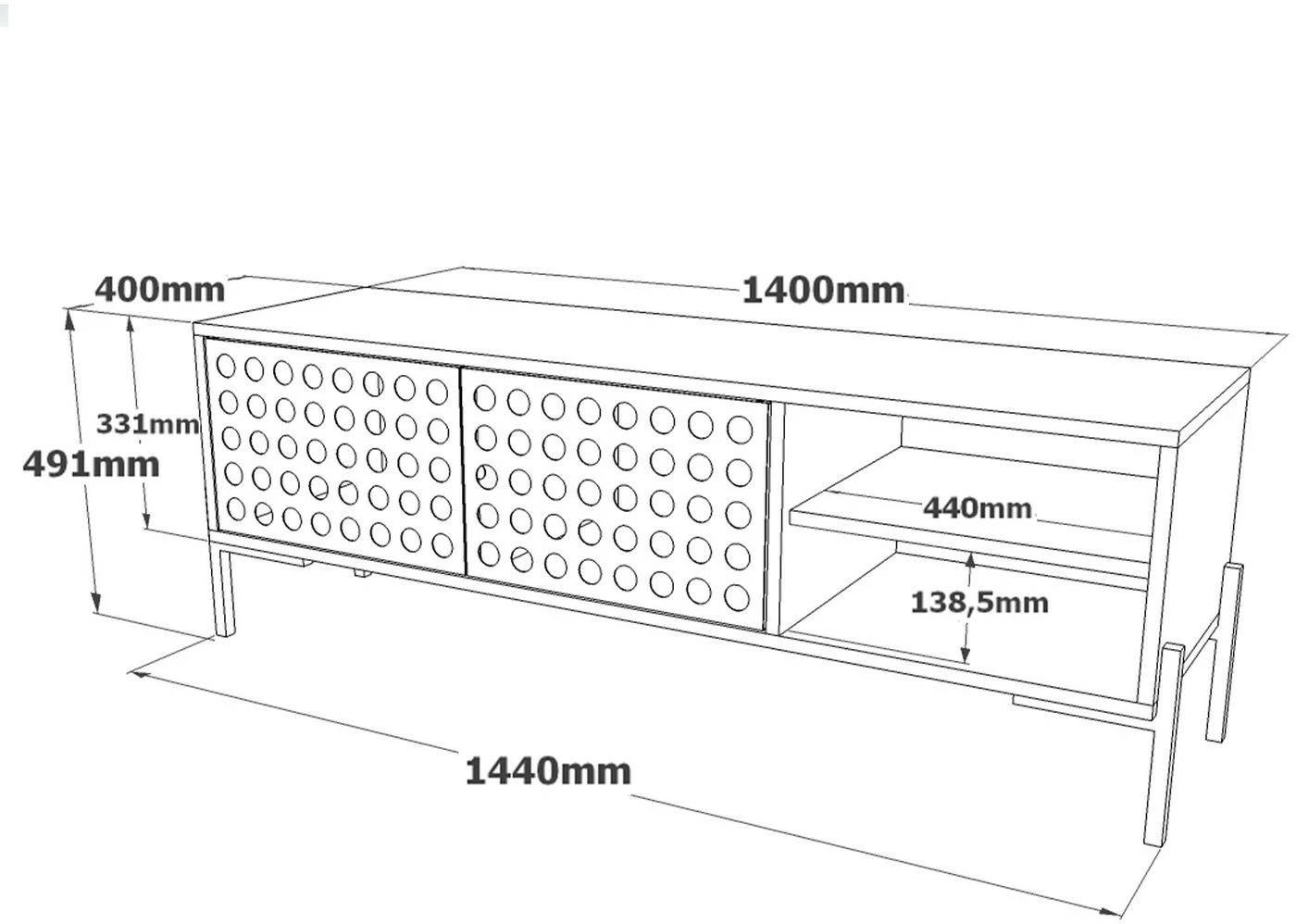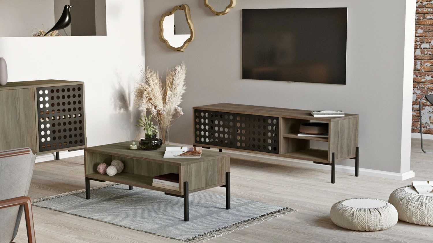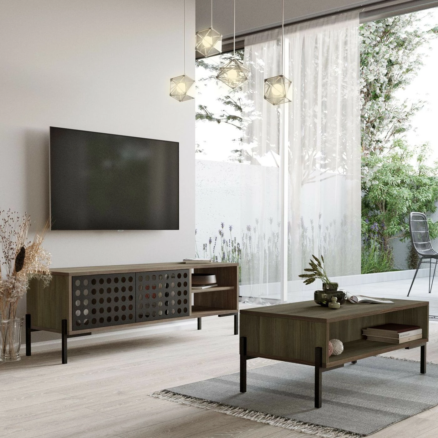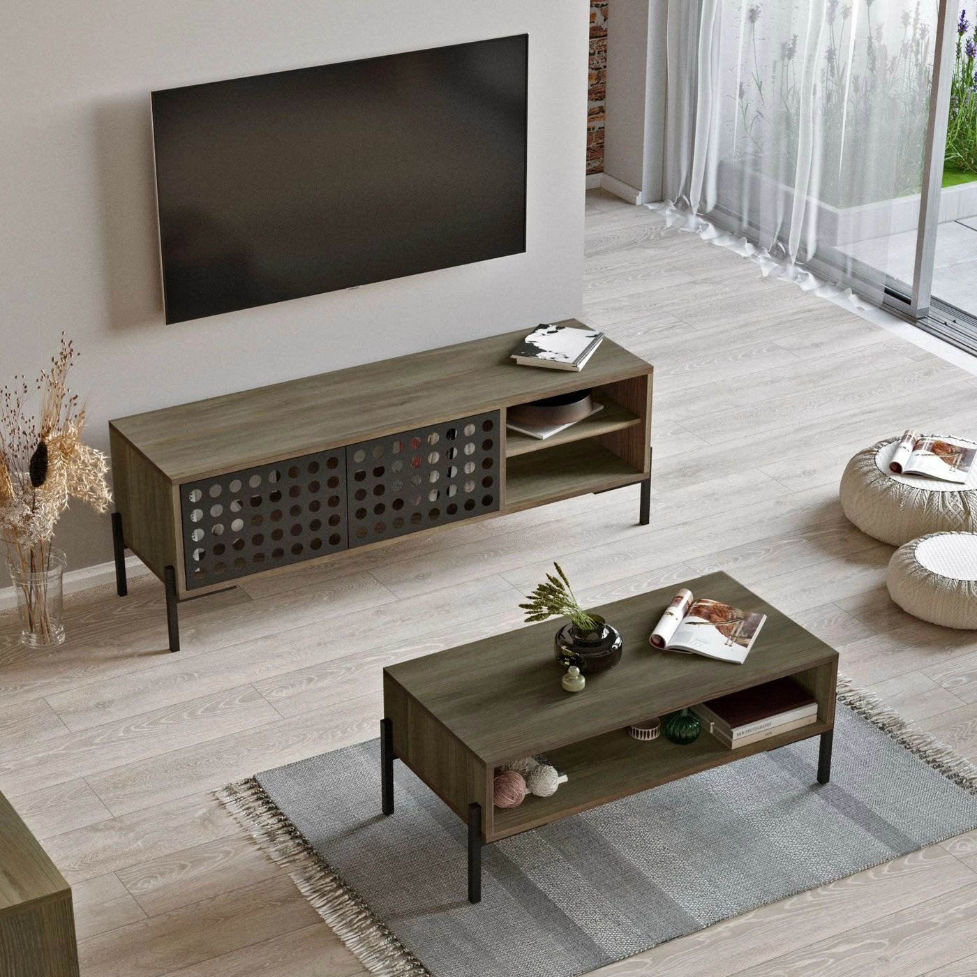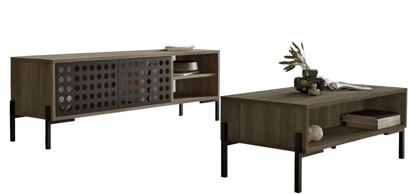 Kaksi kärpästä yhdellä iskulla. Setti sisältää TV-tason ja sohvapöydän. TV-tason reikäkuviointi on veikeä yksityiskohta.