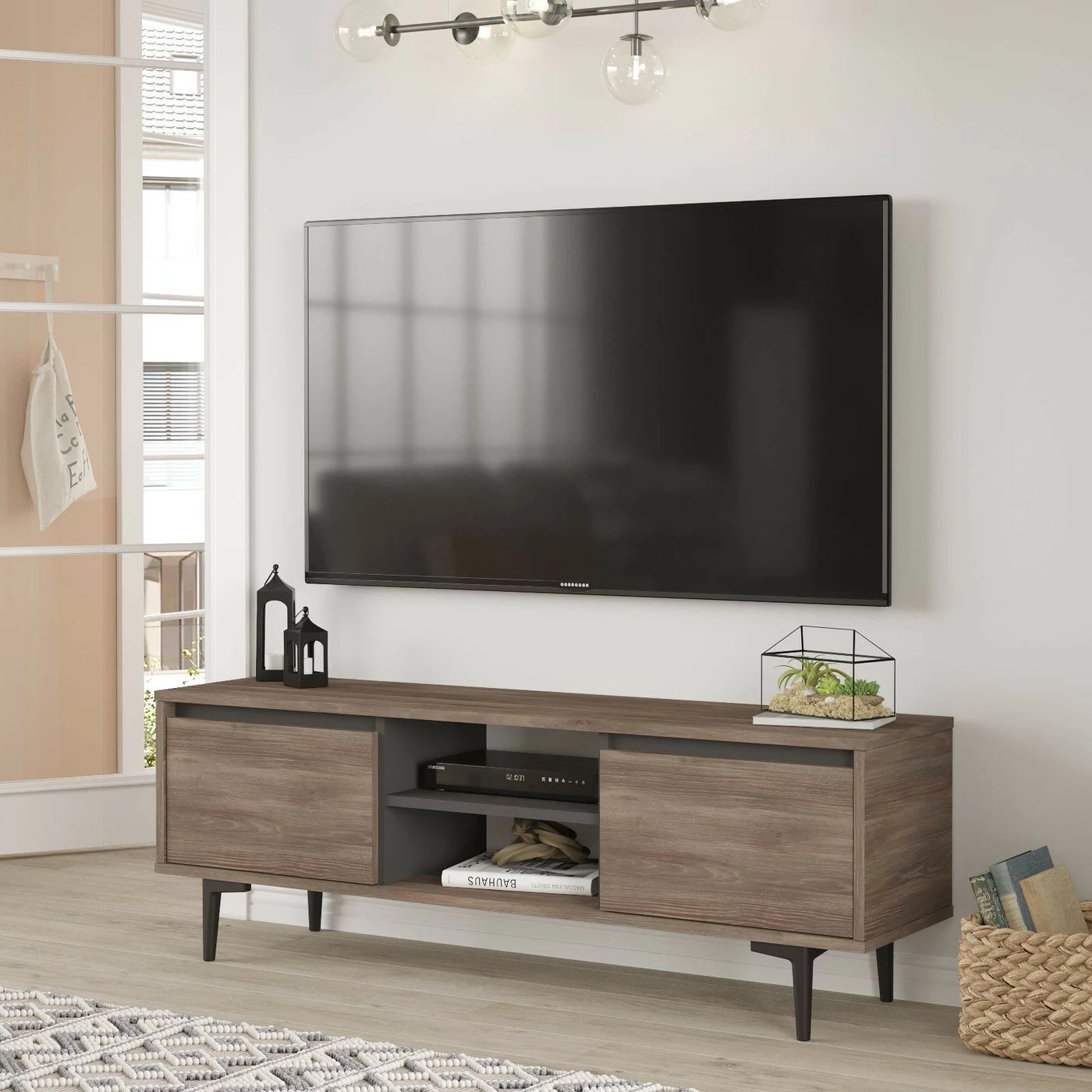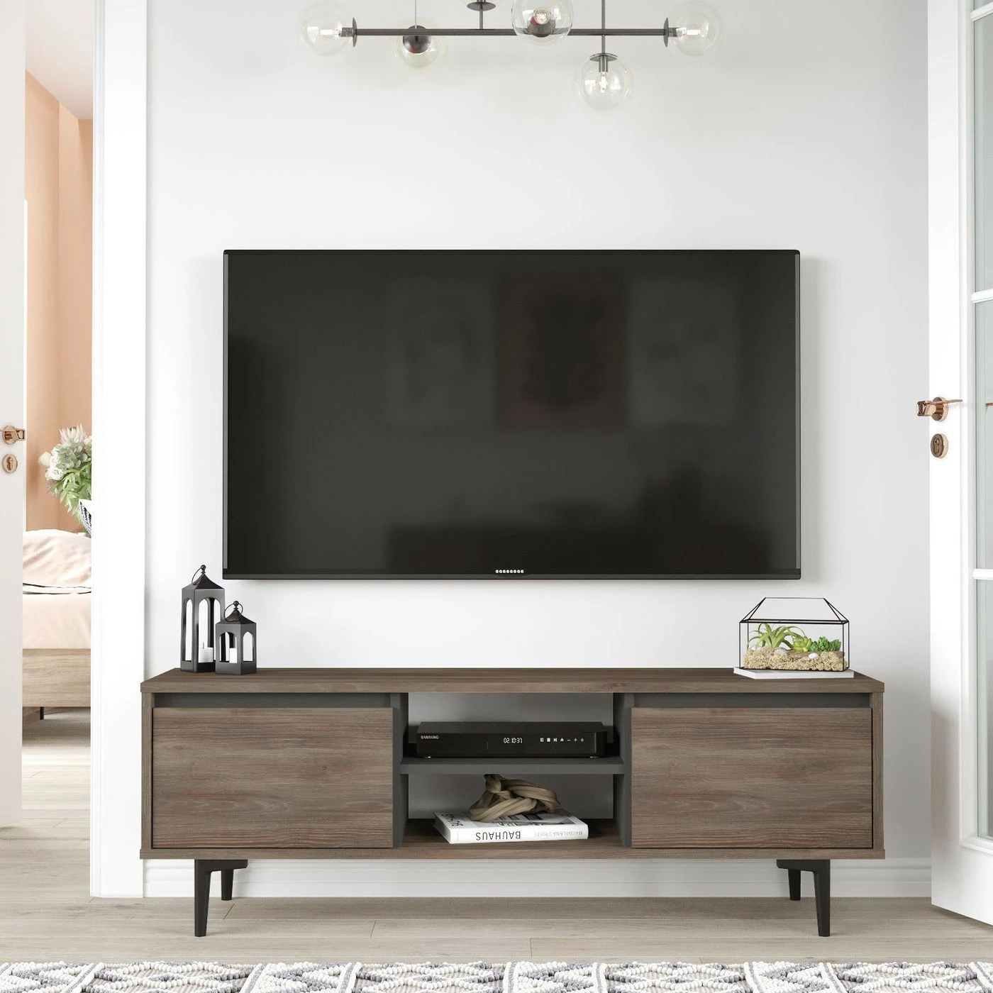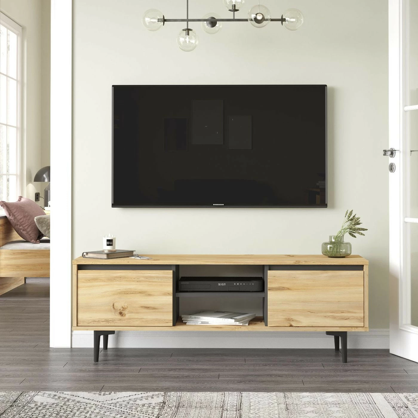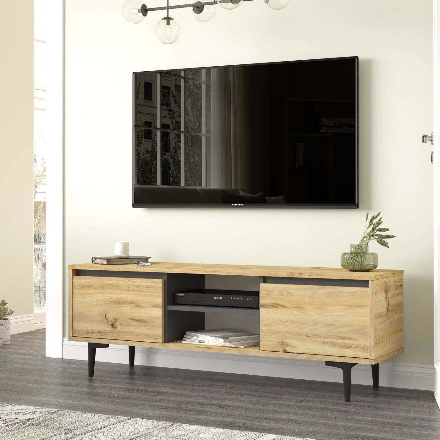 Linento Furnituren AR1-TV-taso. Keskiosan hylly ja laatikoiden yllä olevat raot ovat antrasiitinharmaat.