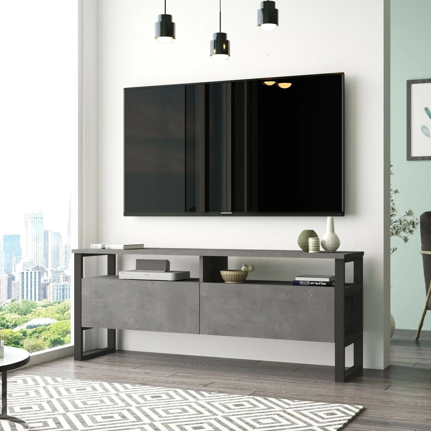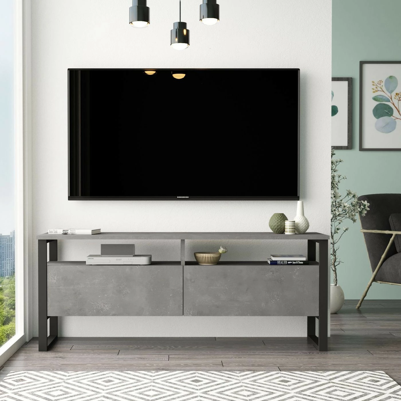 Kivikuosinen LV11-TV-taso. Metalliset jalat antavat tasolle reipasta ryhtiä.
