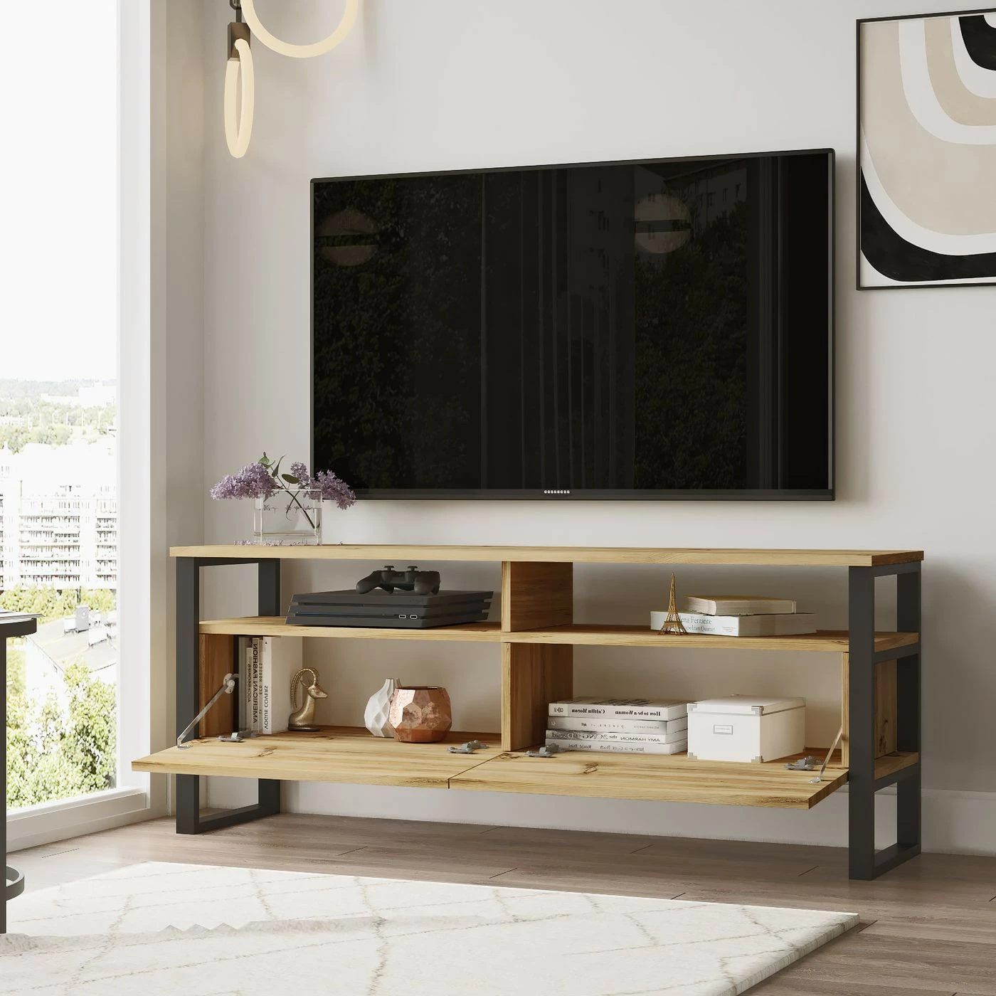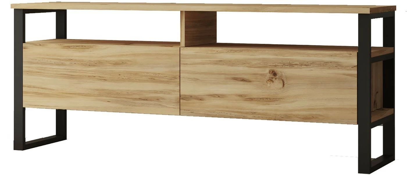 Puukuosinen LV11-TV-taso. Metalliset jalat antavat tasolle reipasta ryhtiä.