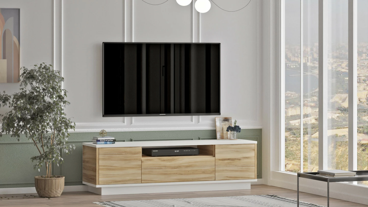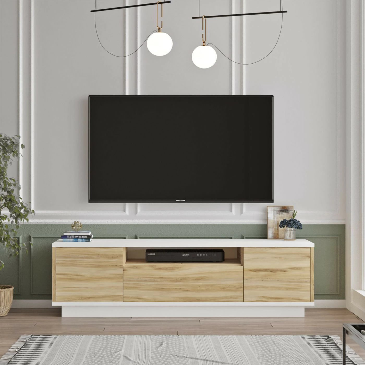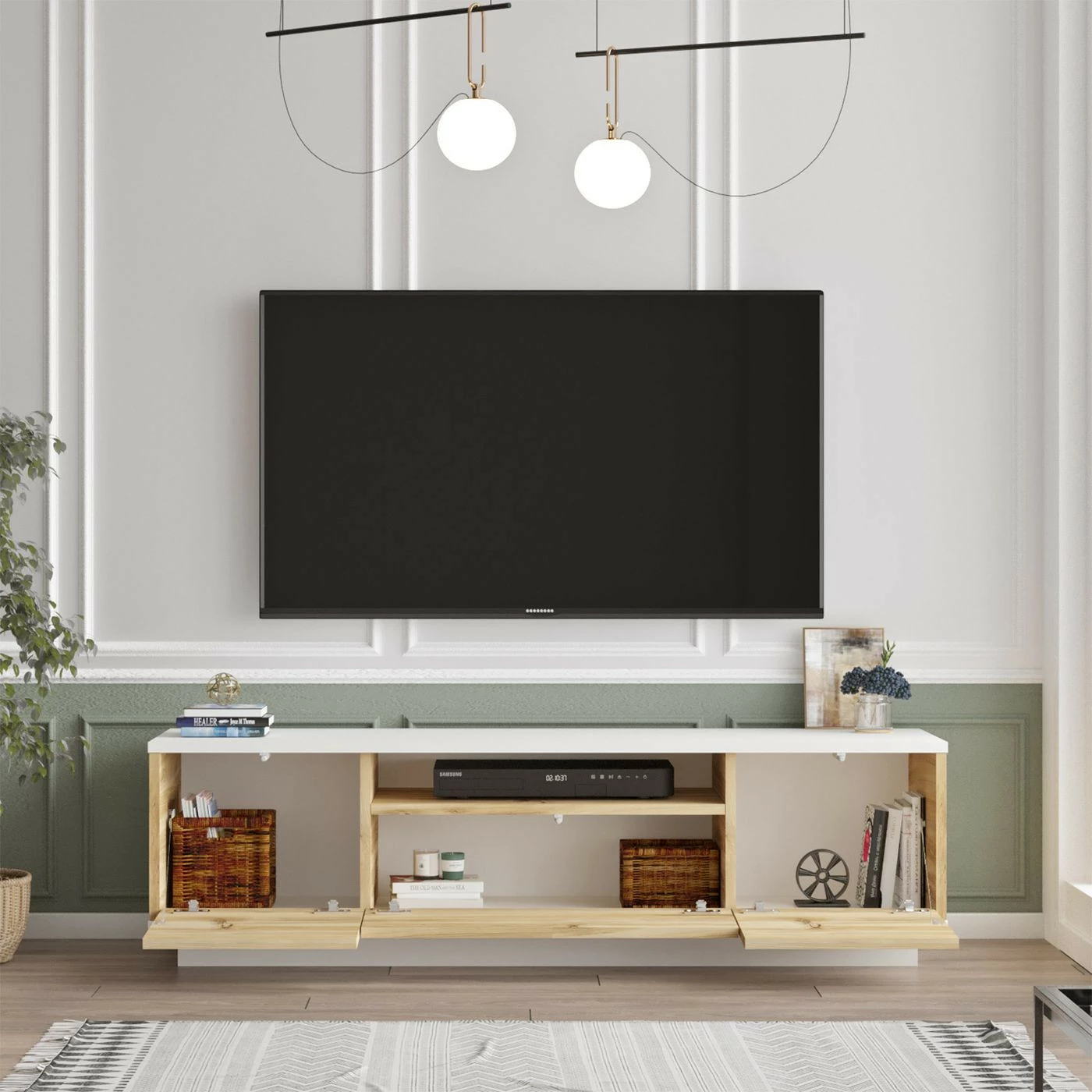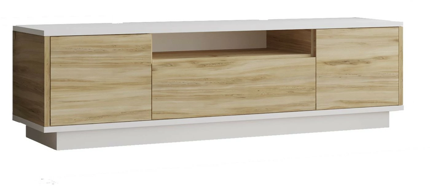 LV4-TV-taso. Kaksivärisen TV-tason kaapeissa on kaunis puunruskea sävy.