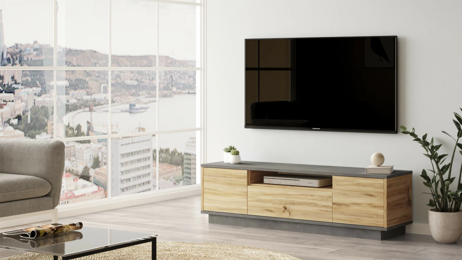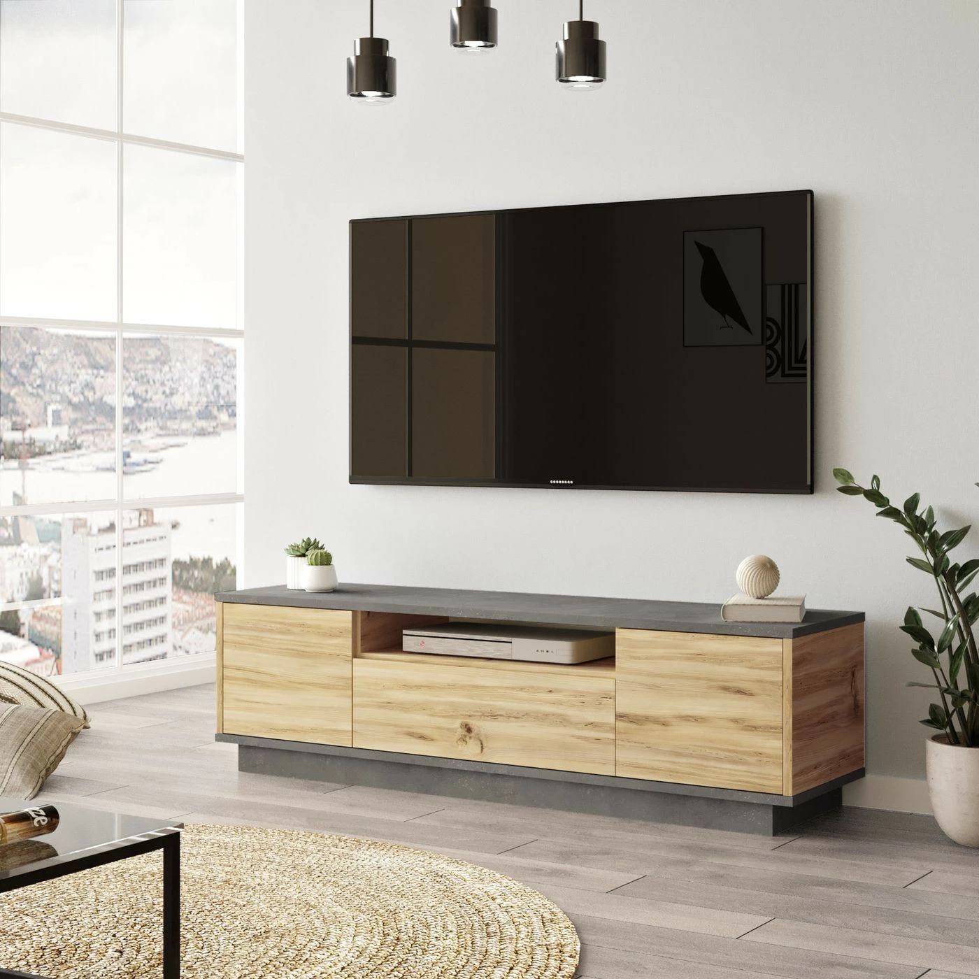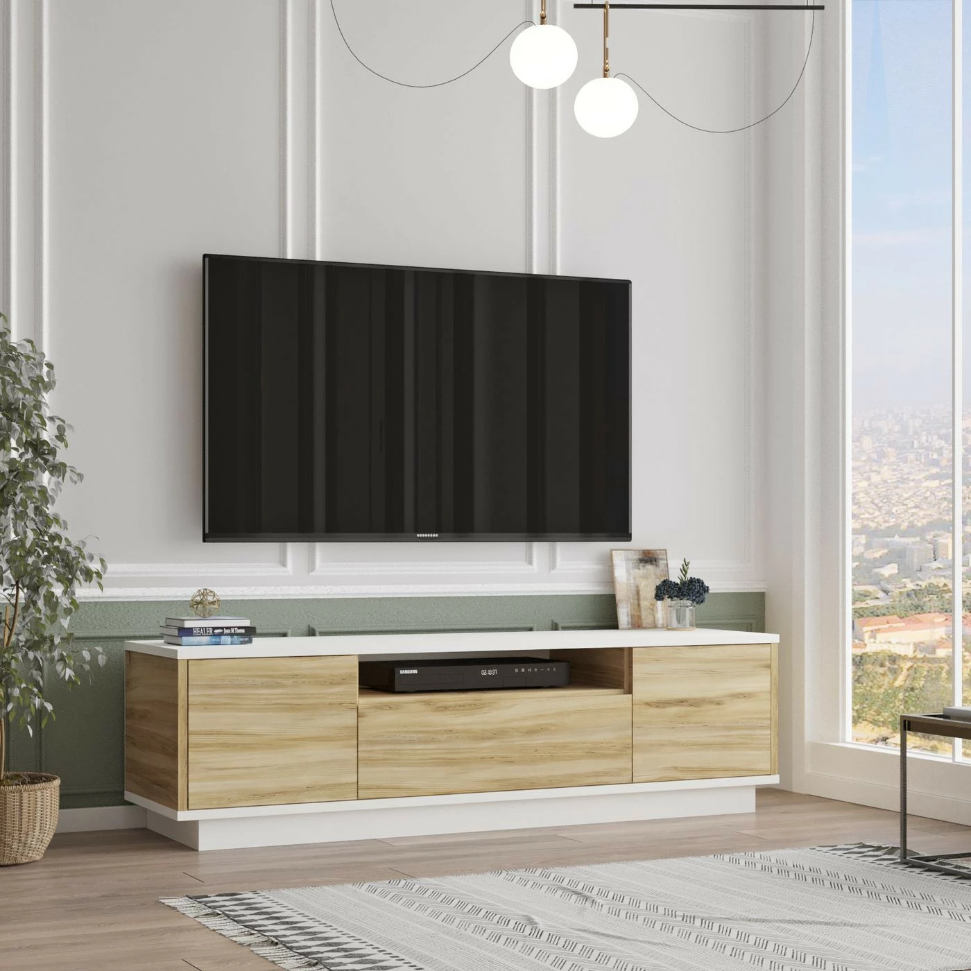 LV4-TV-taso. Kaksivärisen TV-tason kaapeissa on kaunis puunruskea sävy.