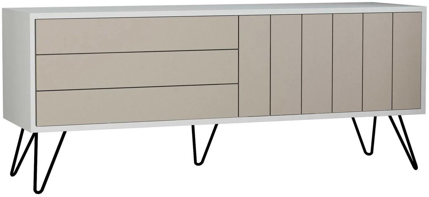Picadilly-TV-taso. Sirot jalat ovat metallia. Tehostevärinen kehys luo kauniin raamin beigelle laatikostolle.