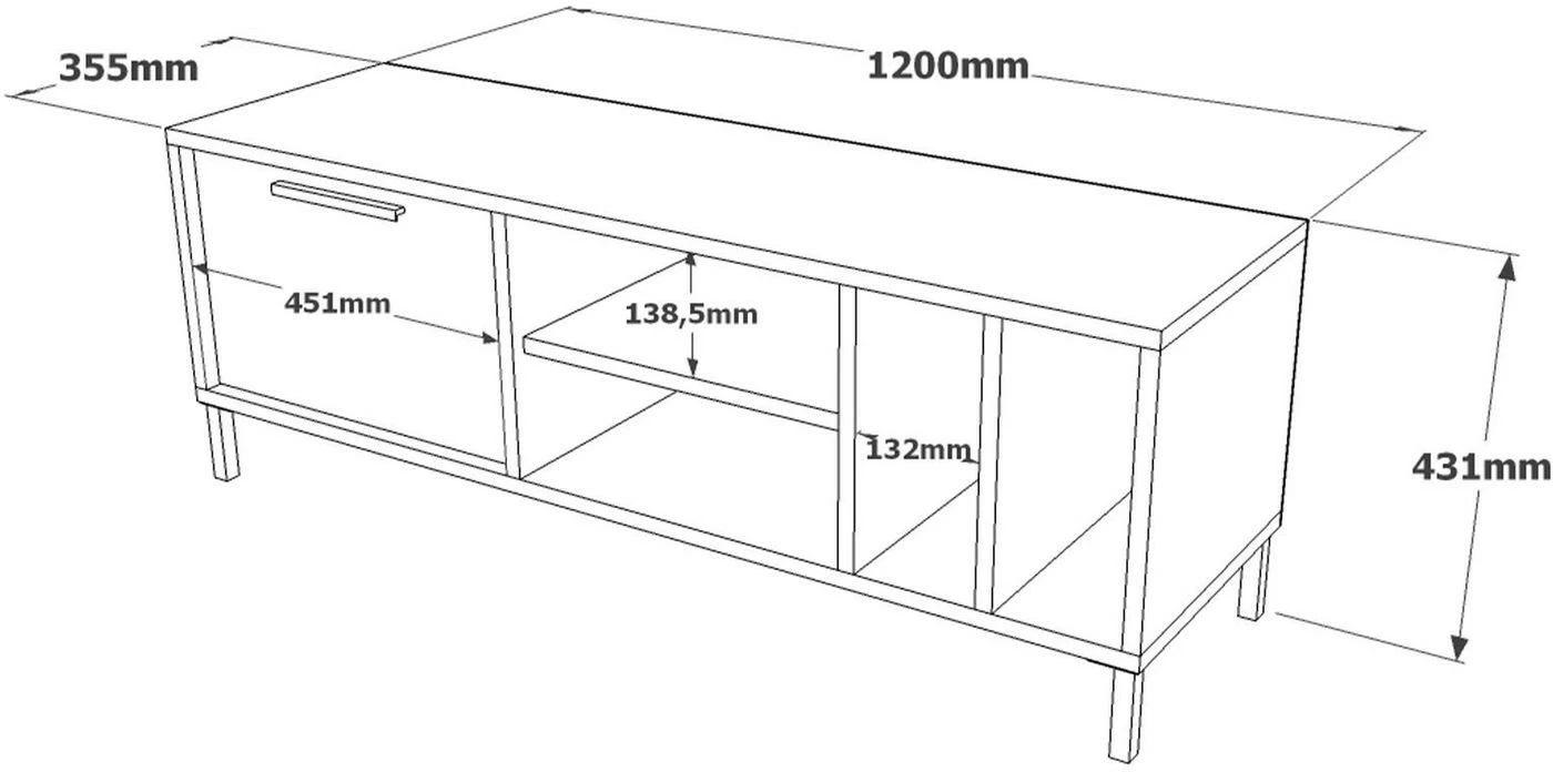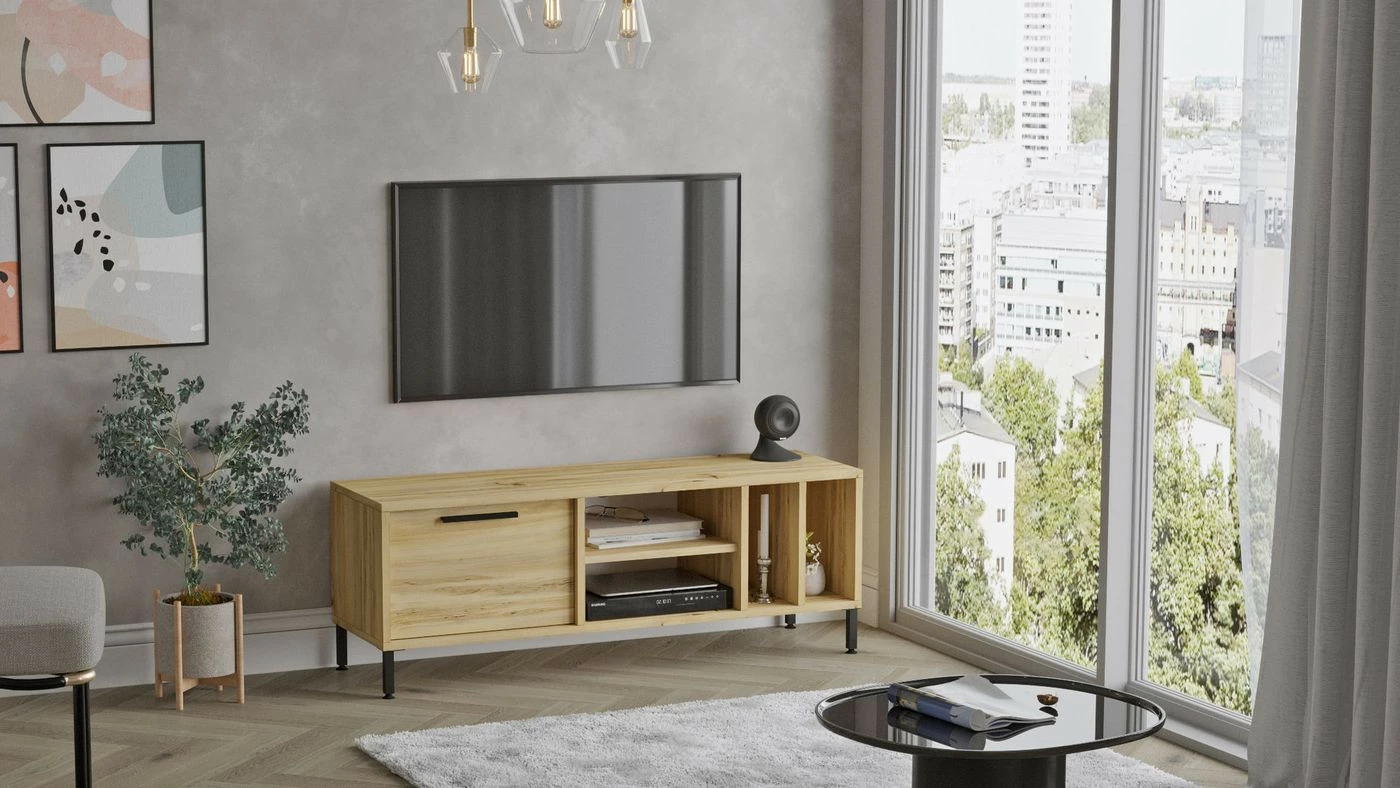 RT2-TV-taso. Laatikko ja hyllyt on ryhmitelty siten, että tavarat voi säilyttää tehokkaasti ja näyttävästi.