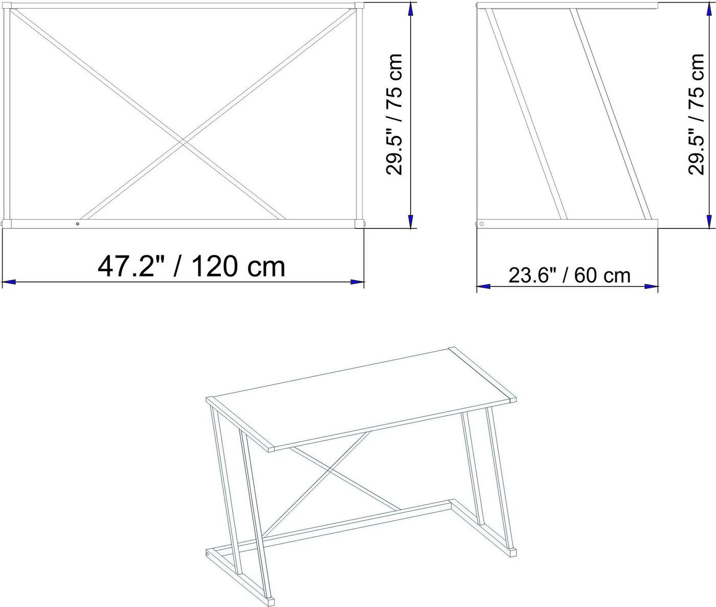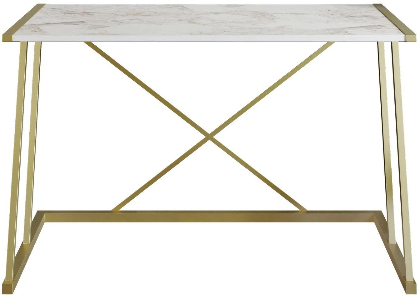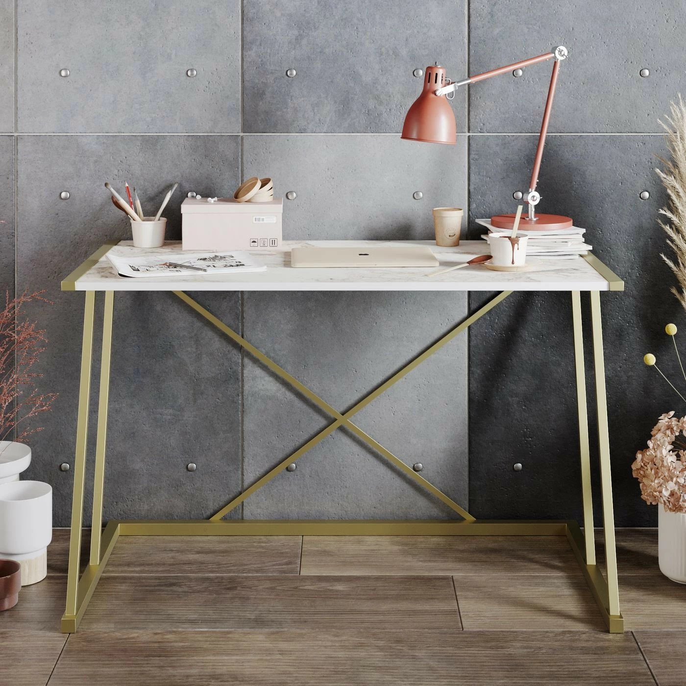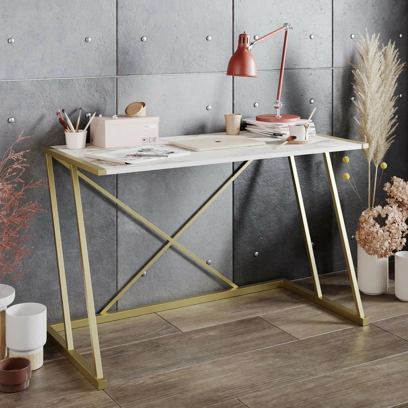 Kaunis Anemon työpöytä, jonka runko on kullanväristä metallia. Valkoisessa pöytälevyssä on marmorikuosi.