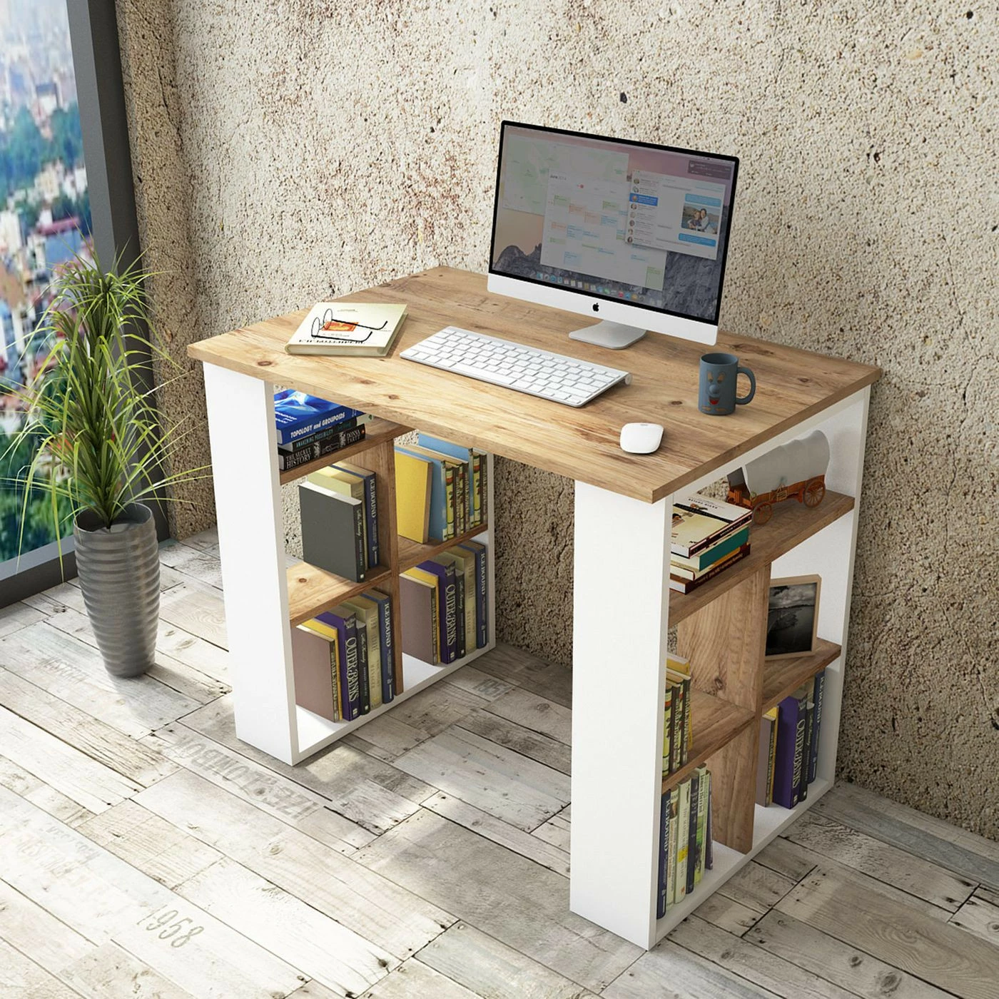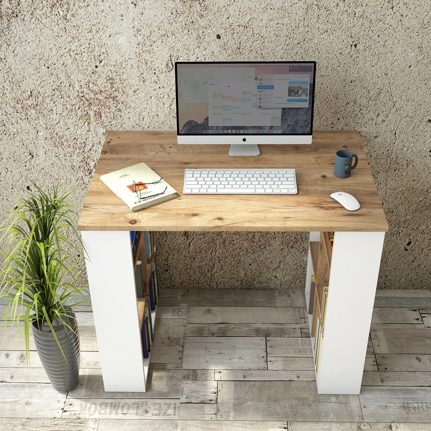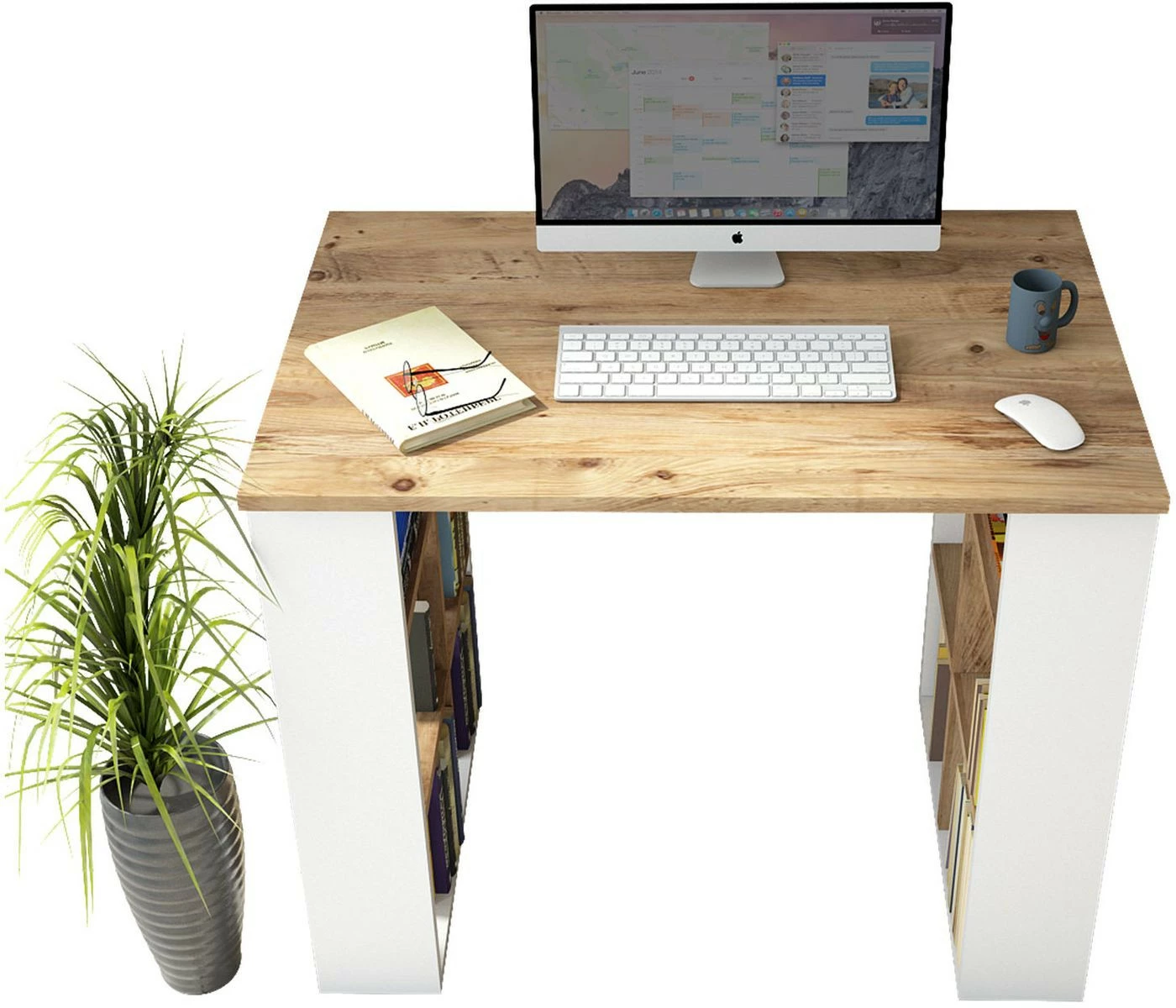 BR1-työpöytä. Pöydän jaloissa on paljon hyllytilaa kirjoille, mapeille ja työvälineille.