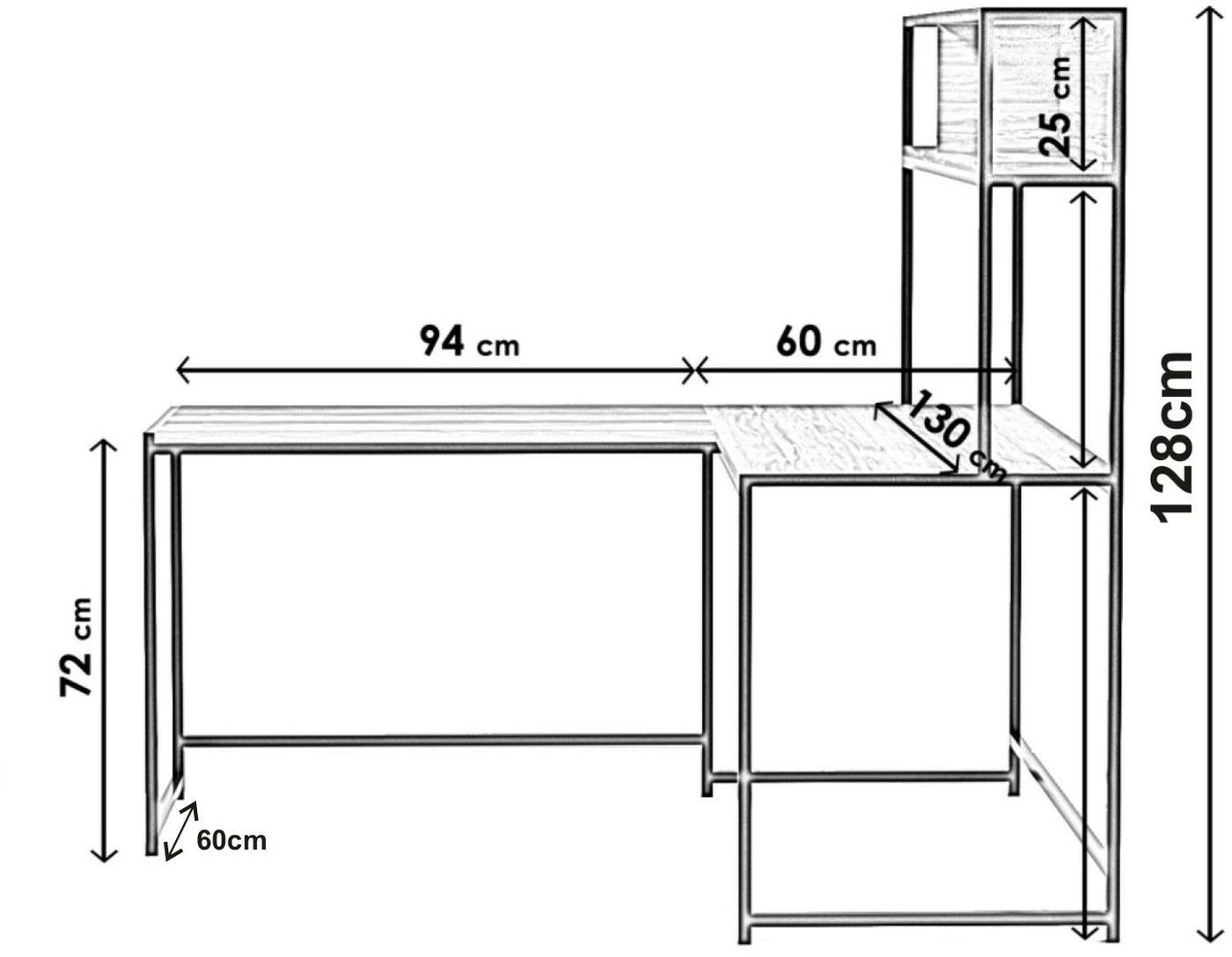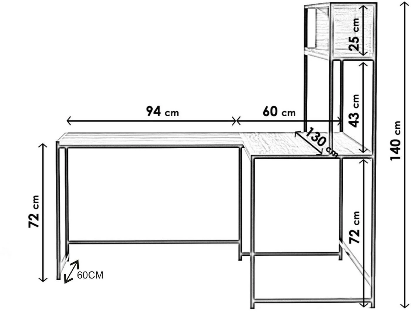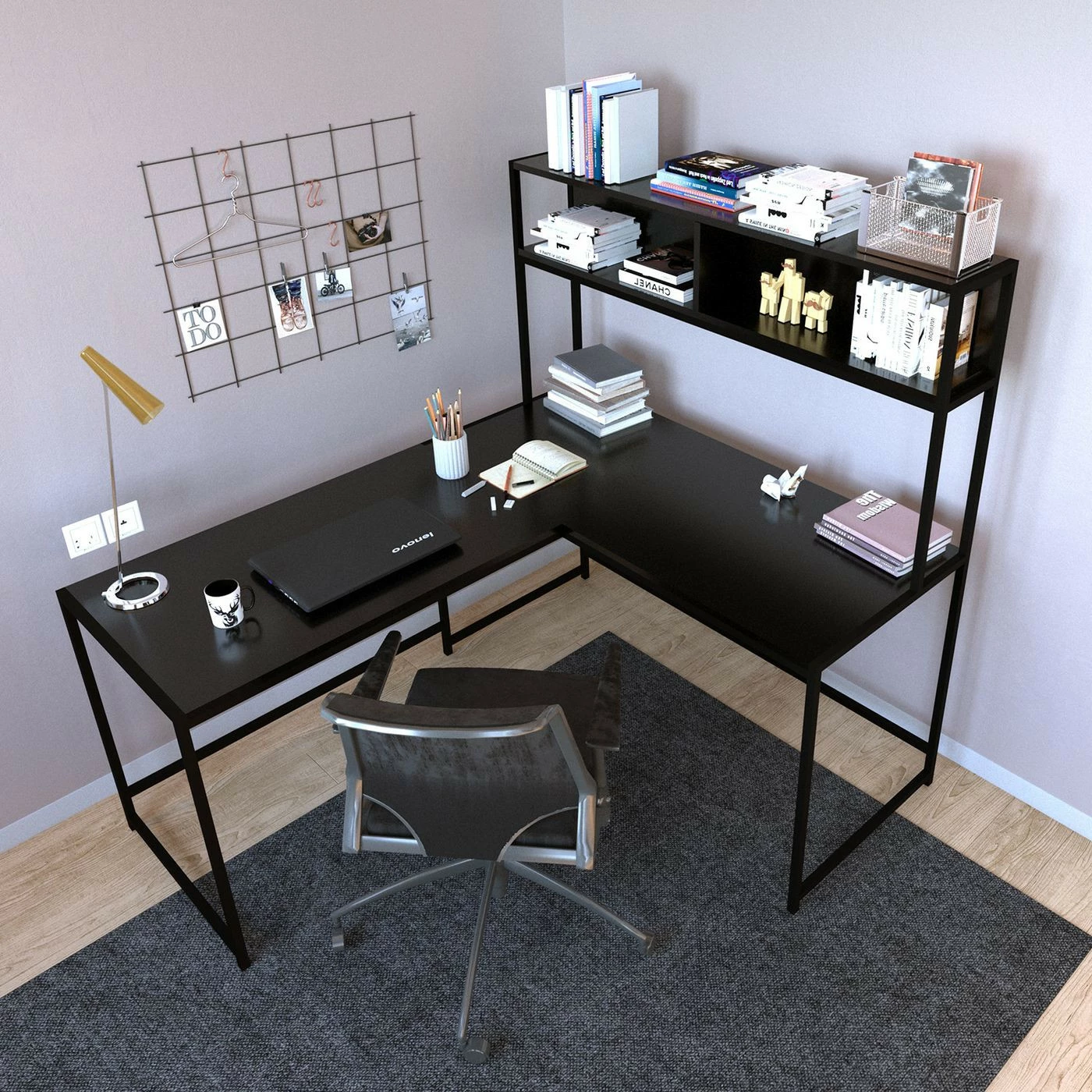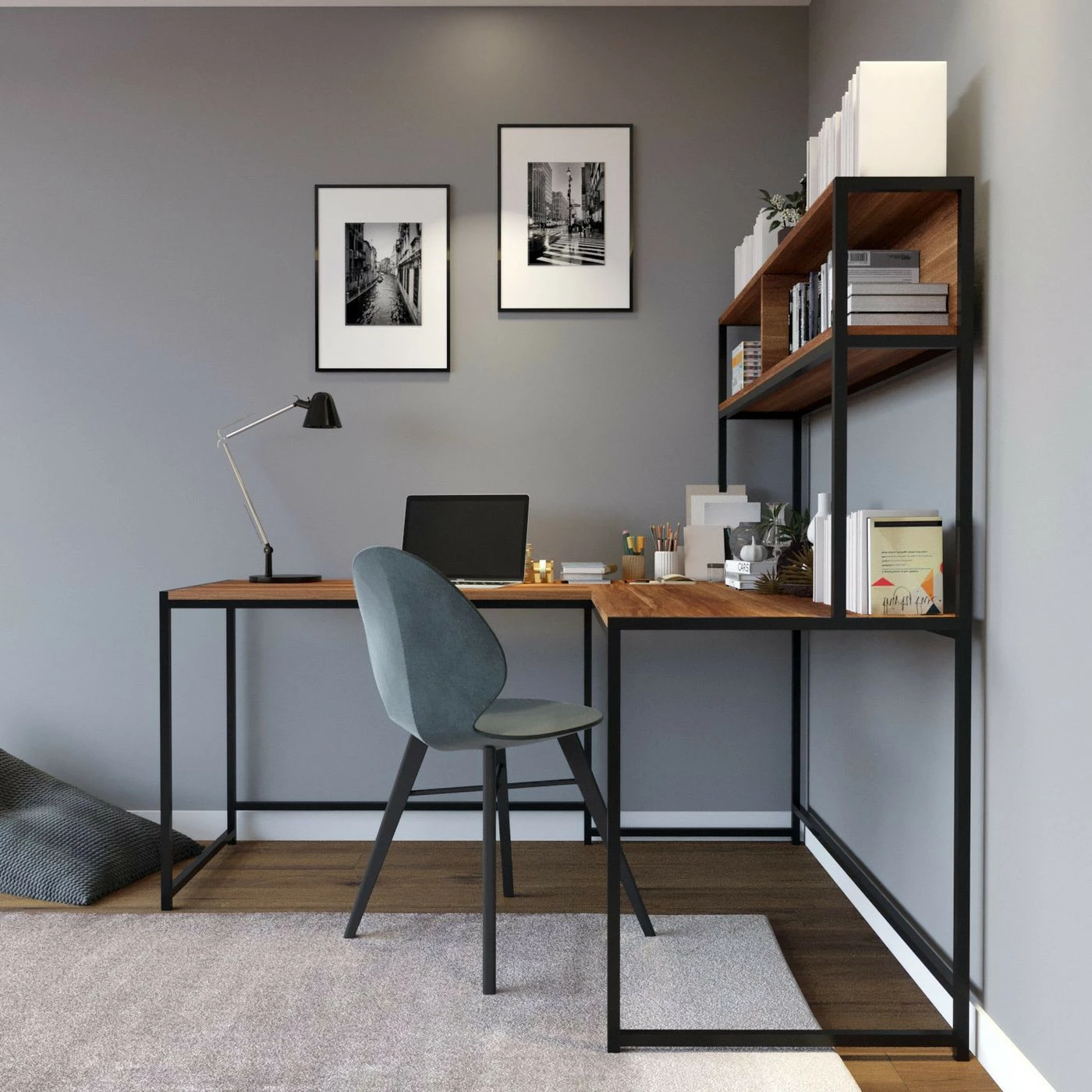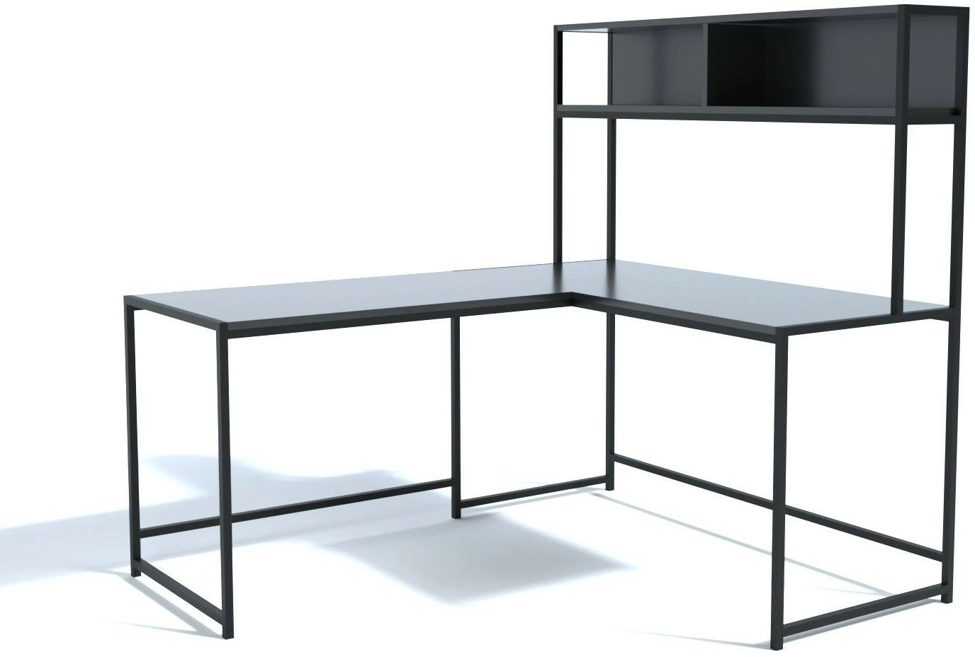 Näppärä työpöytä kotikonttoriin, opiskelijalle tai koululaisen huoneeseen. Kokonaisuus sisältää L-muotoisen työpöydän ja kirjahyllyn. Jalka/runko on mustaksi maalattua metallia.