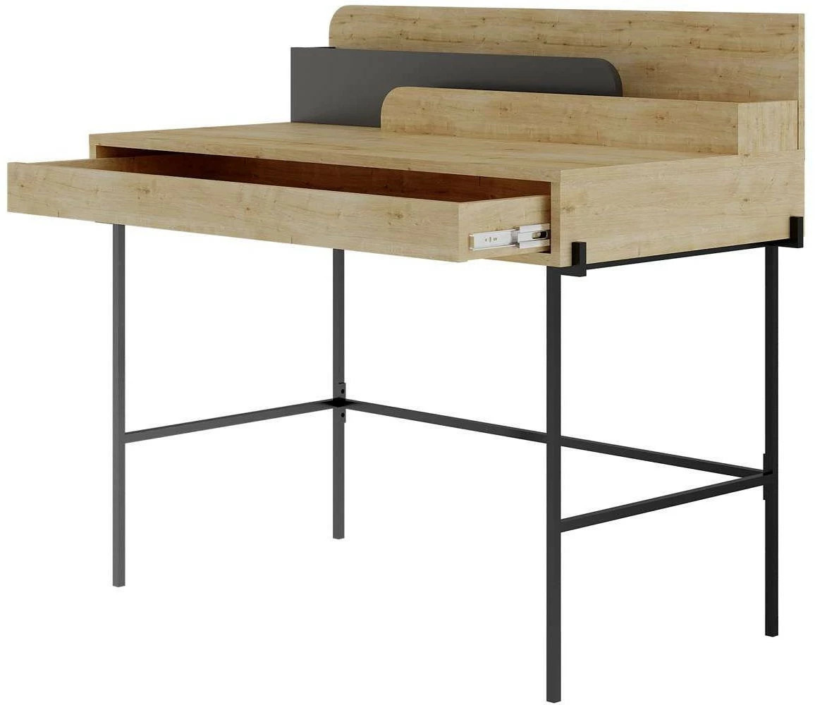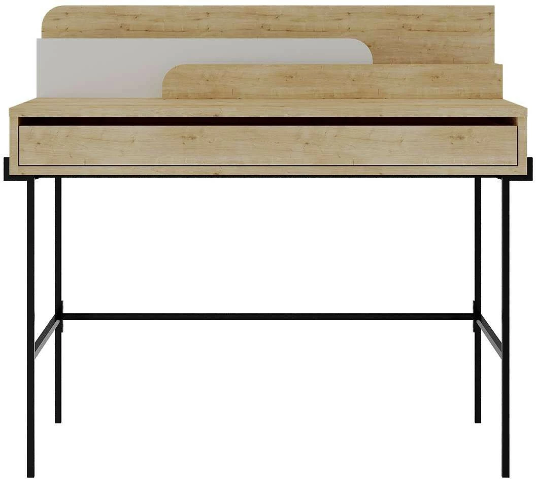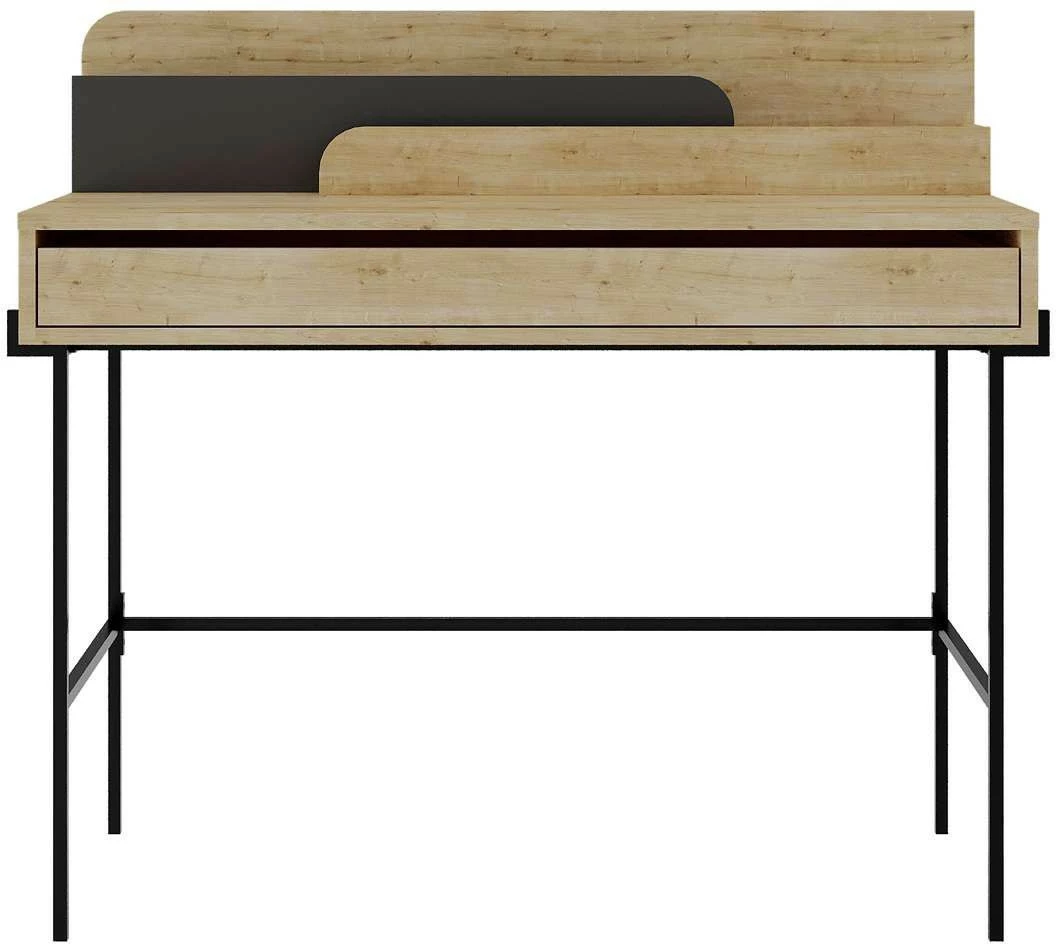 Leila-työpöytä. Ruskean pöydän pöytätasolla on tehostevärinen osio, joka toimii pidikkeenä lehdille tai vihkoille. Näppäimistölle on oma vetohyllynsä pöydän alaosassa.
