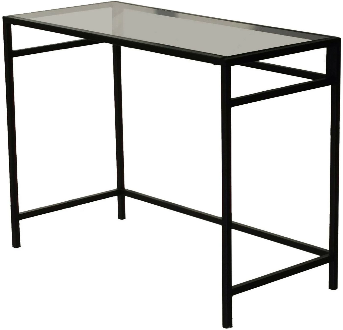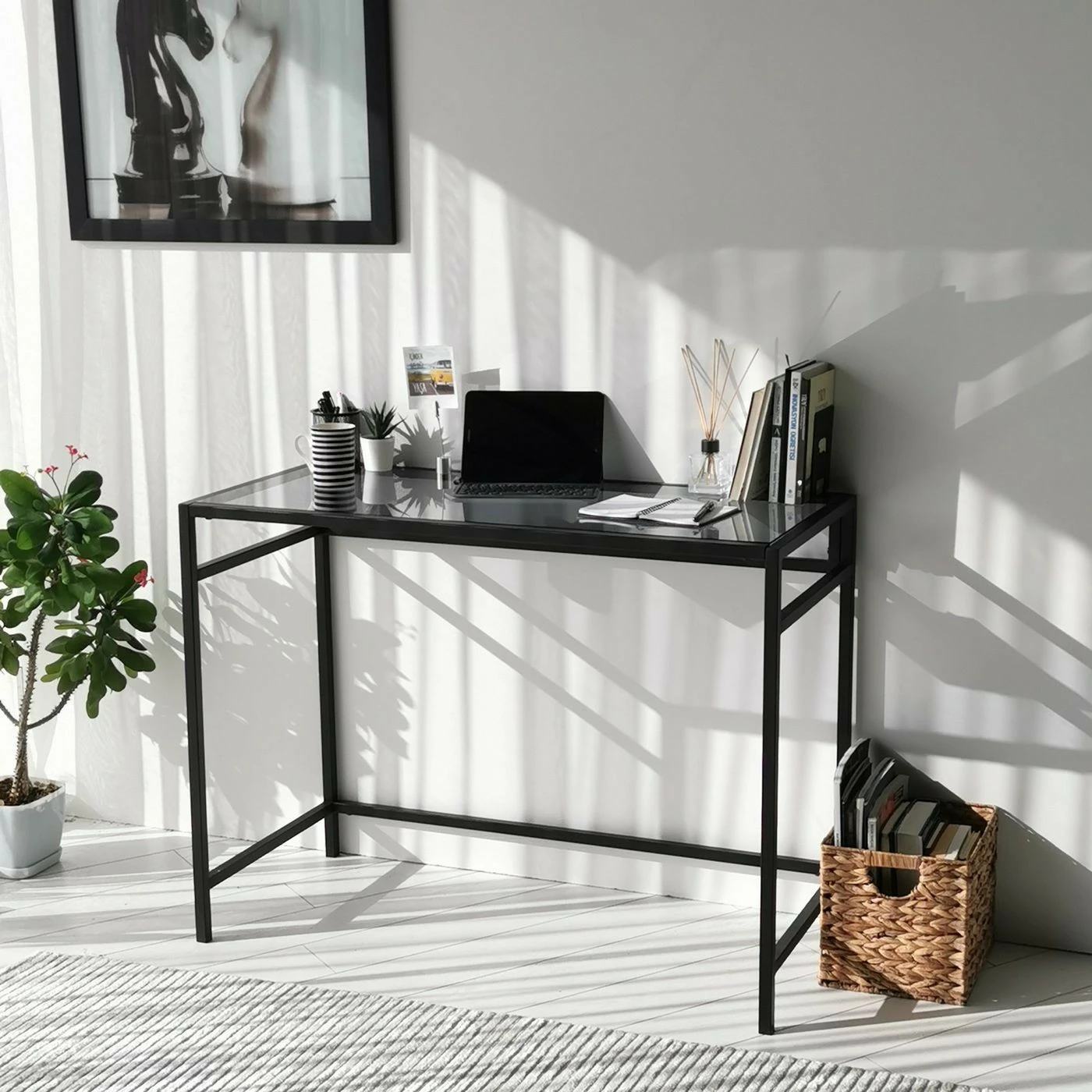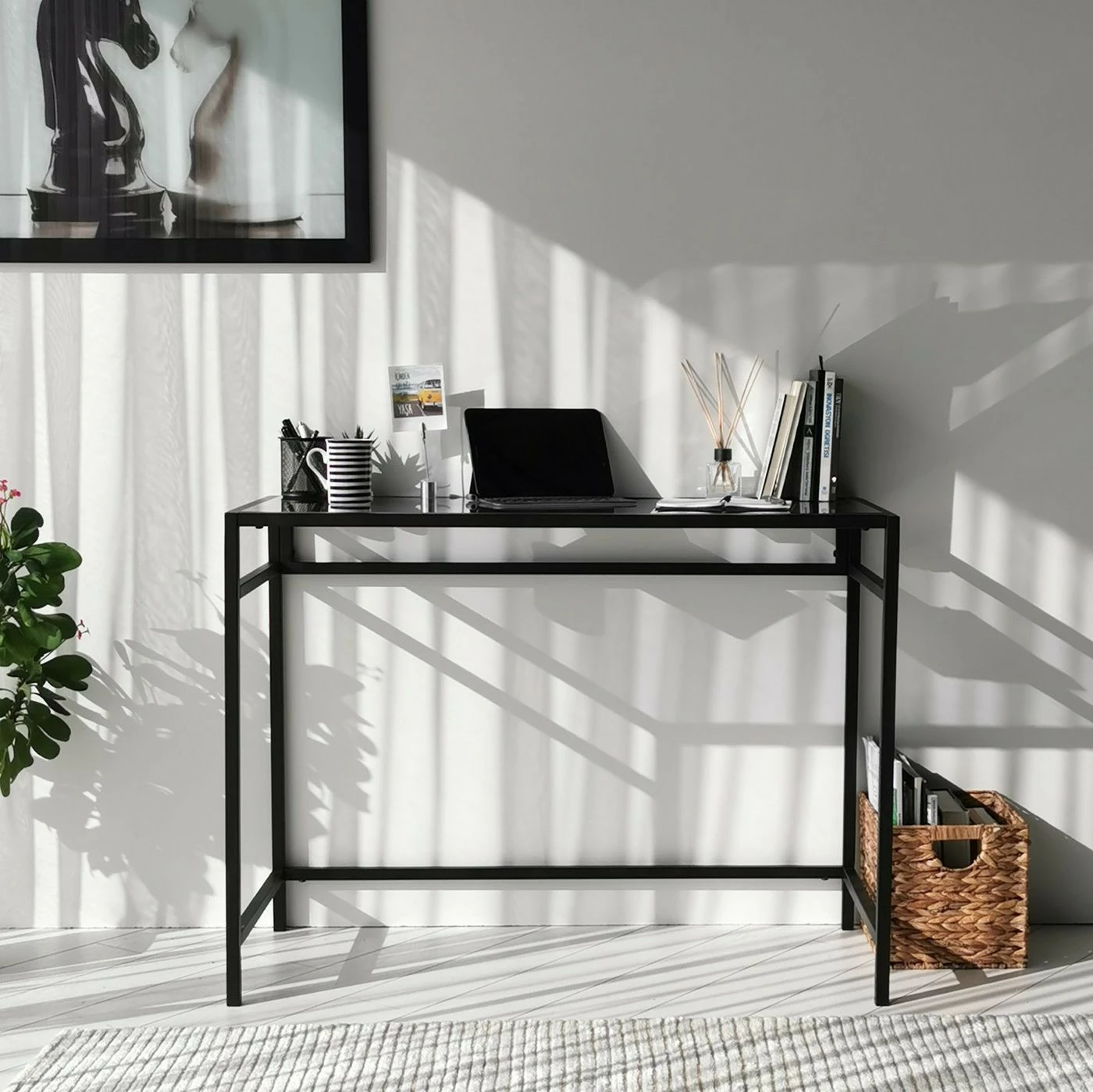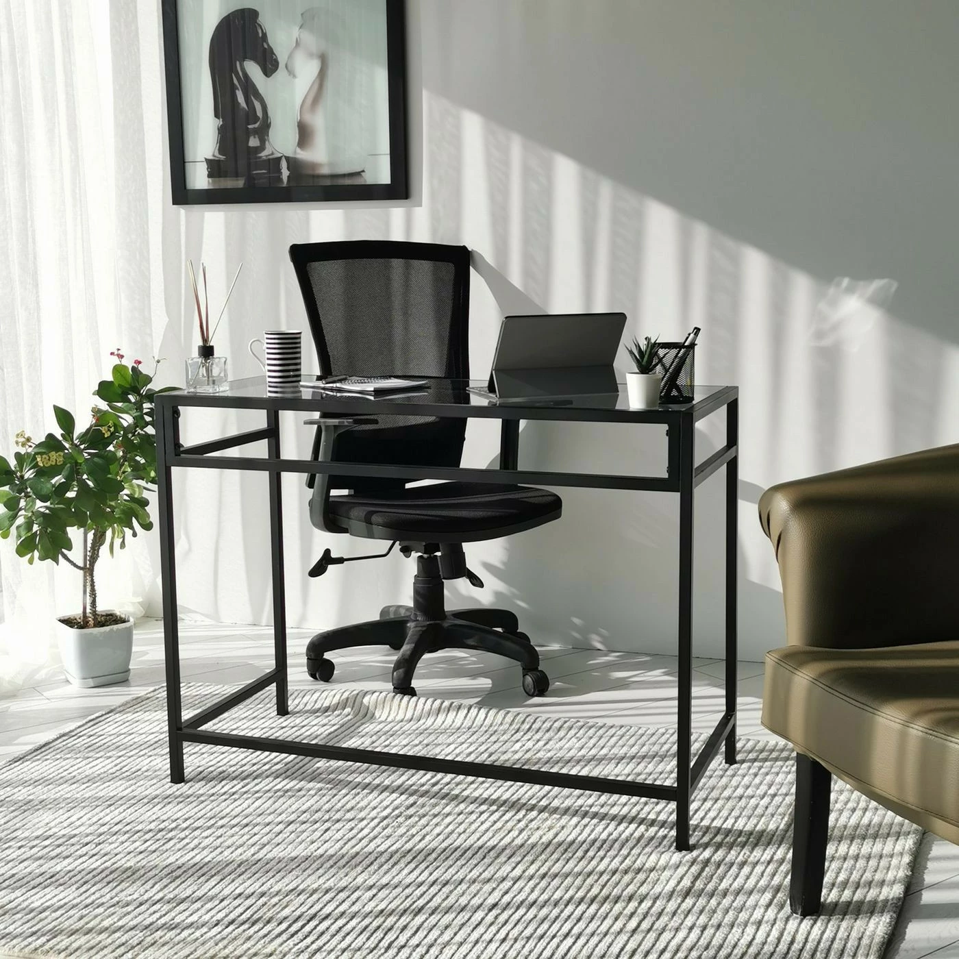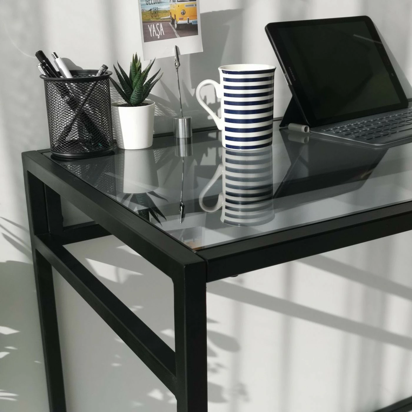 Network-työpöydässä on musta metallirunko ja lasinen pöytätaso.