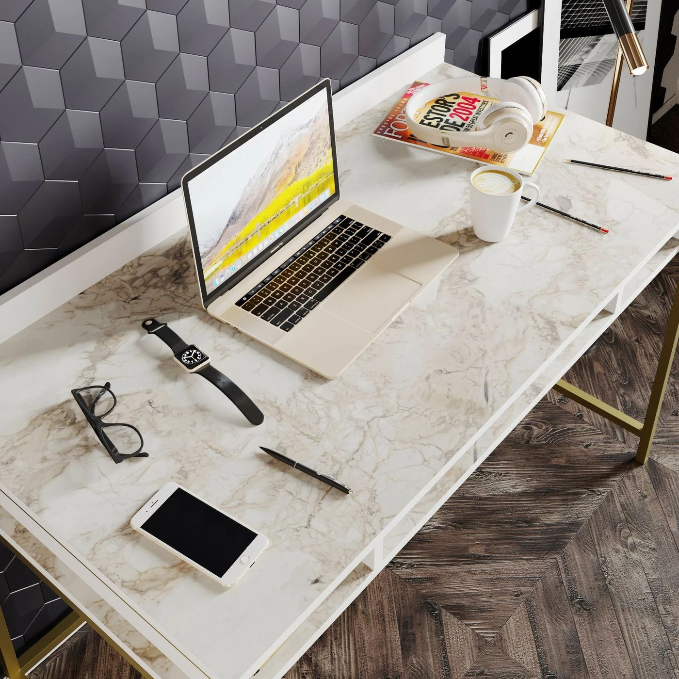 Upea työpöytä, jonka runko on metallirunko on kullanvärinen. Valkoisessa pöytälevyssä on marmorikuosi.