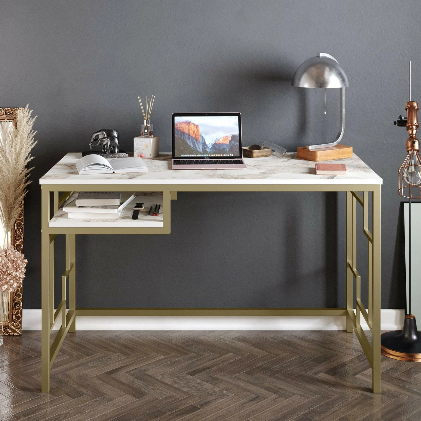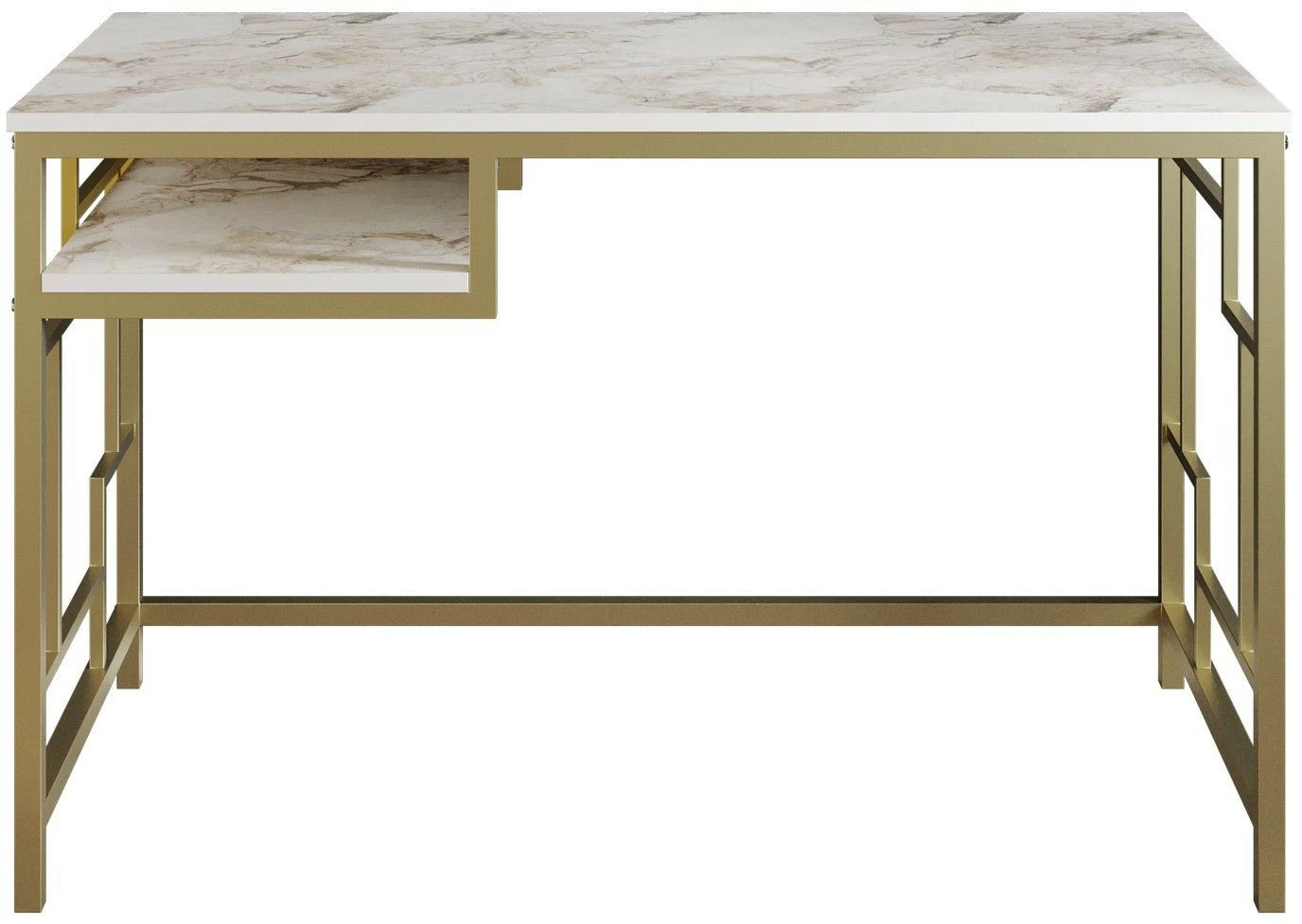 Näyttävä työpöytä, jonka runko on metallirunko on kullanvärinen. Valkoisessa pöytälevyssä on marmorikuosi.