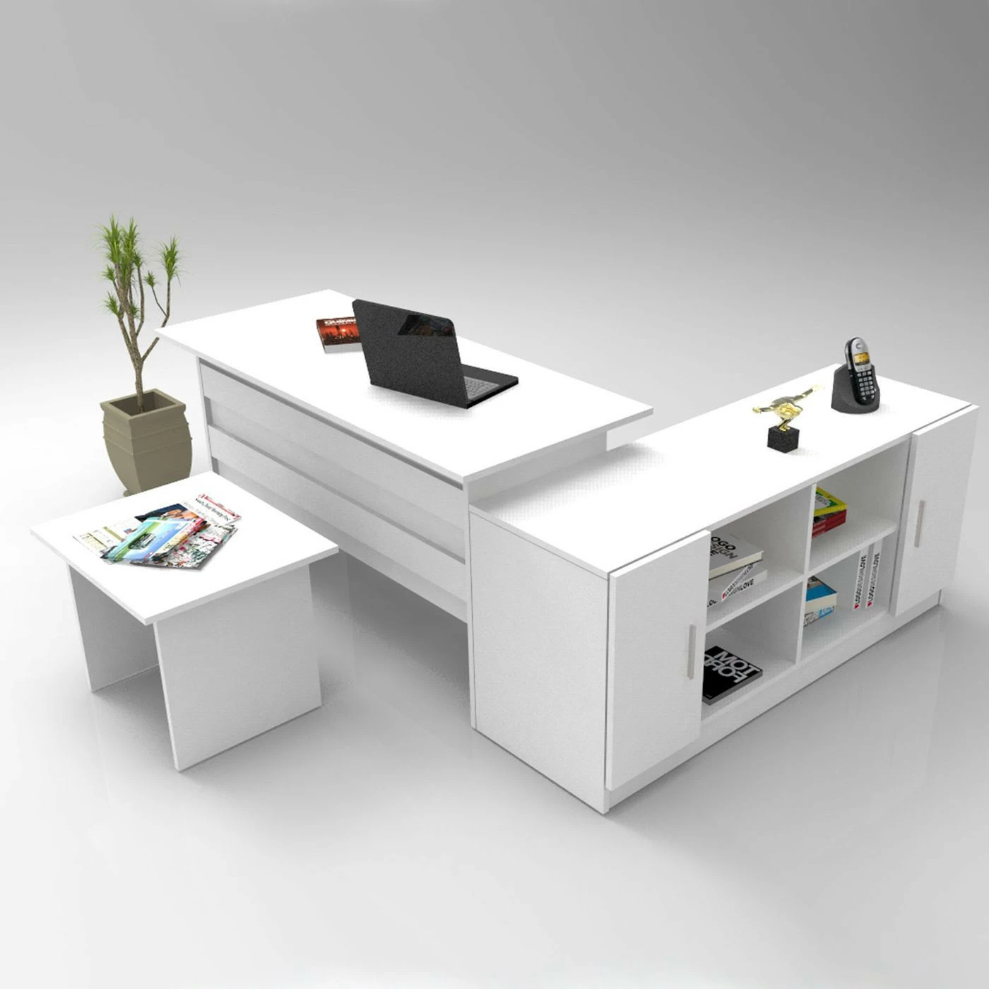 Anna kotitoimistollesi yhtenäinen ilme. Kokonaisuus sisältää työpöydän, apupöydän ja sivukaapin.