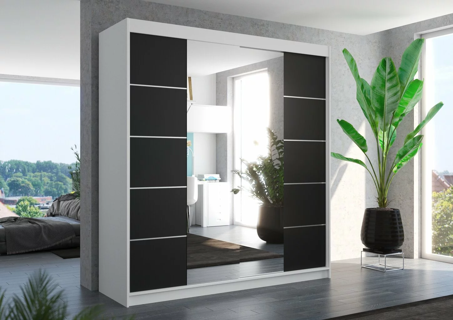 - Moderni kaappi, jossa kaksi liukuovea peileillä;