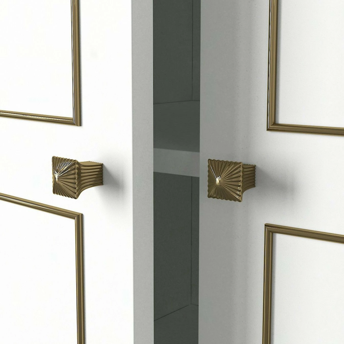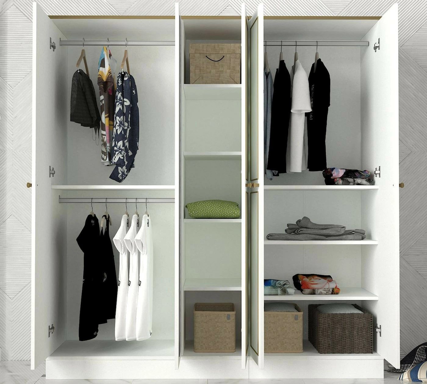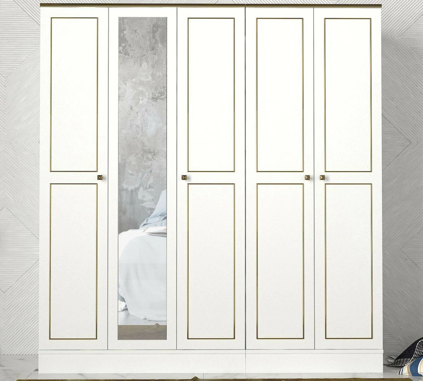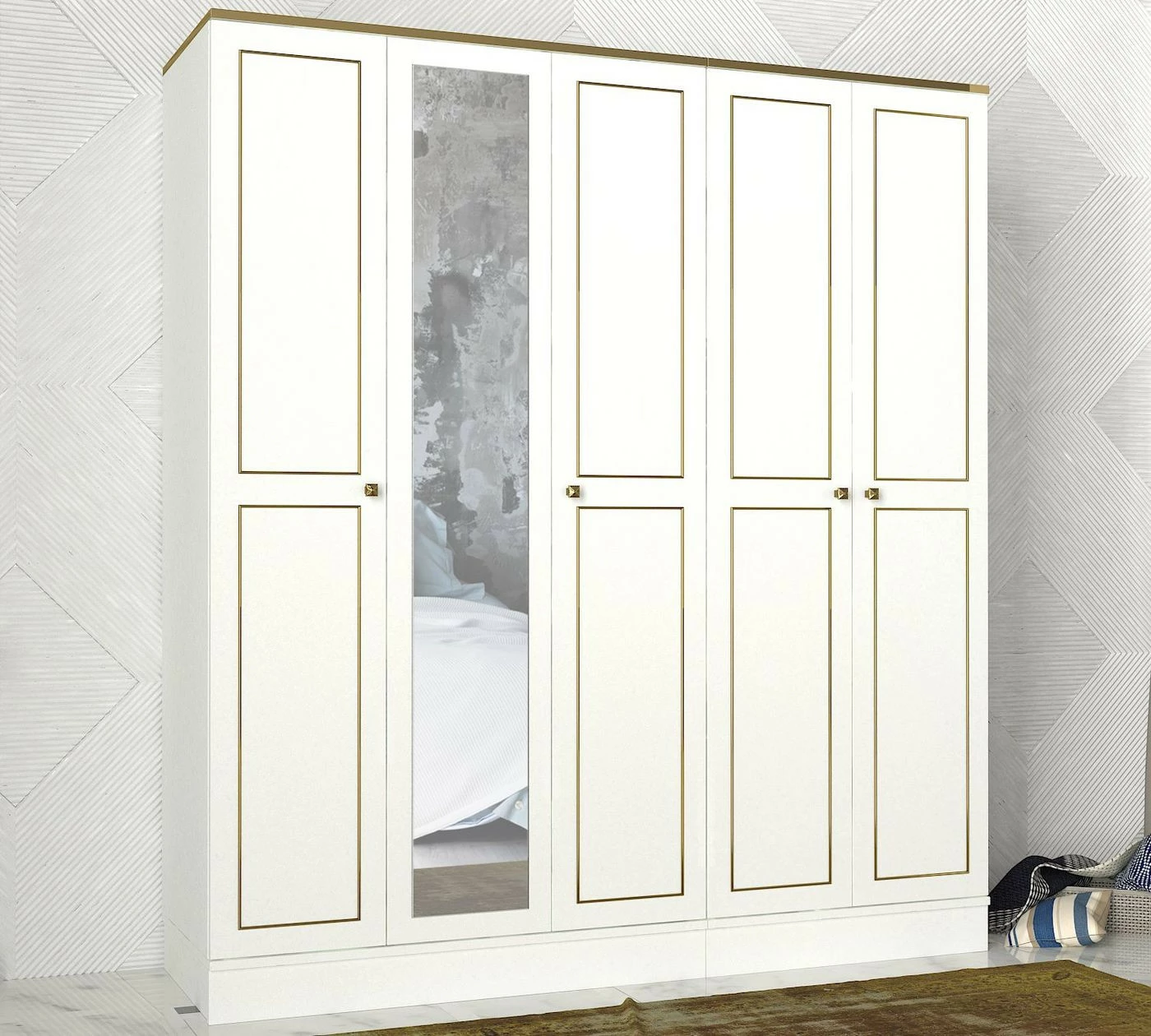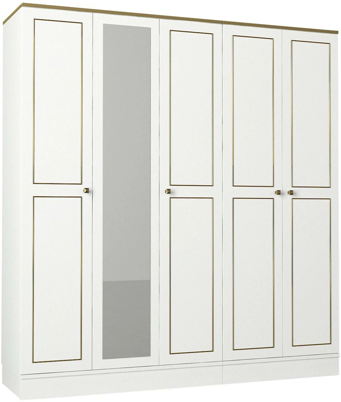 Ravenna 5 -vaatekaappi. Peilistä voit tarkistaa, että päivän asu on tiptop. Ovien koristekuviot ovat kullanväriset.