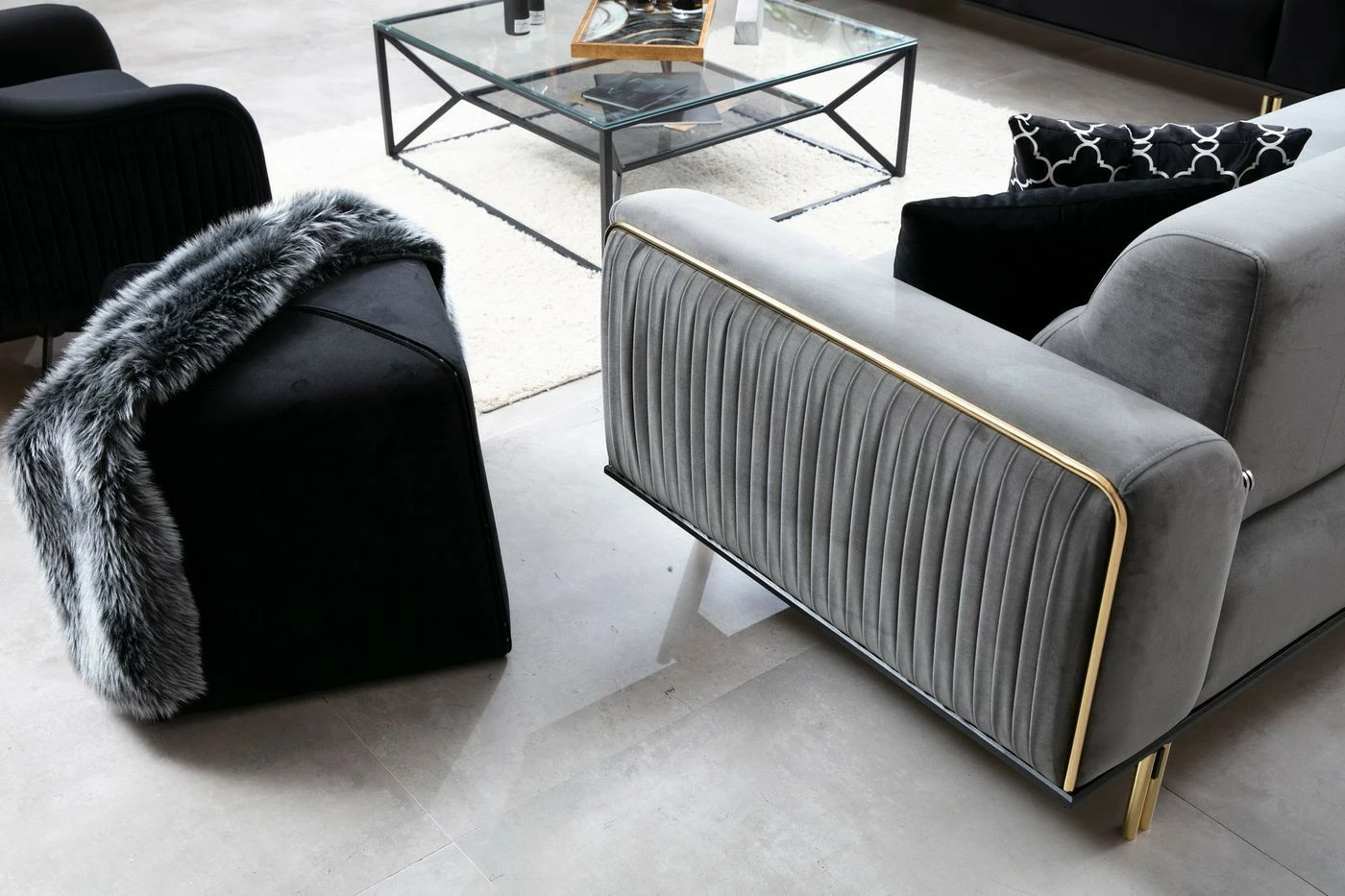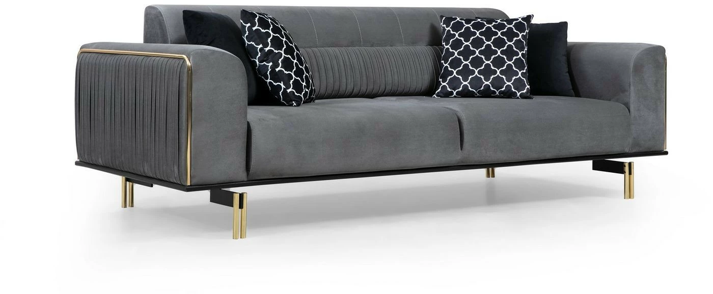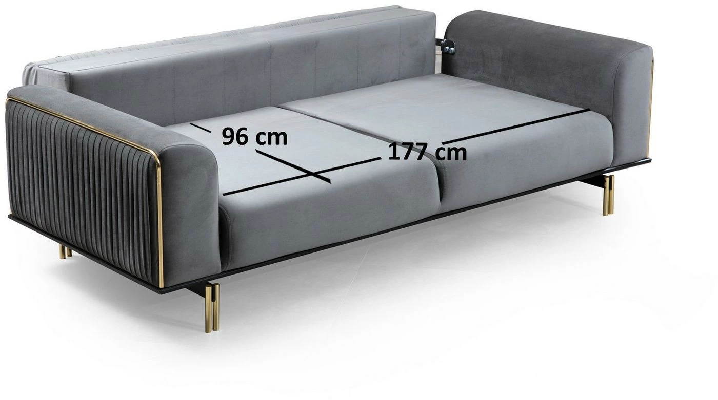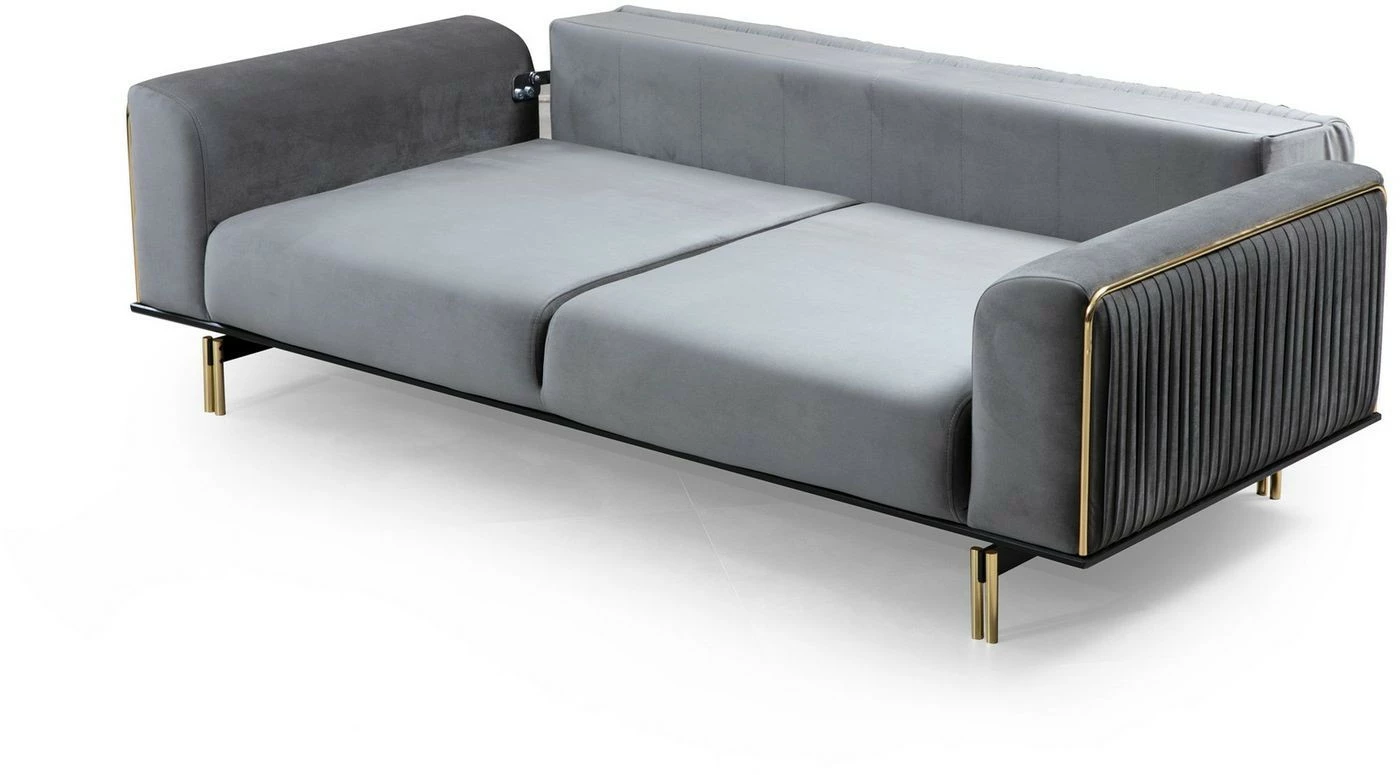 Säväyttävässä London-sohvassa on ajattoman harmaa tekstiiliverhoilu ja kullanväriset yksityiskohdat. Varavuoteeksi muuttuva London tarjoaa nukkumapaikan yövieraalle.
