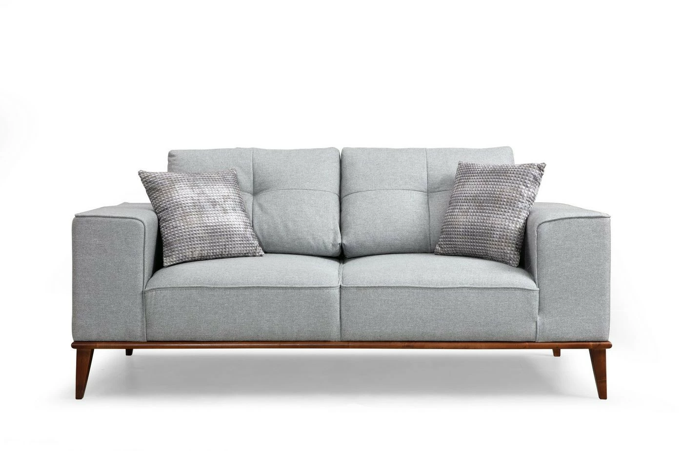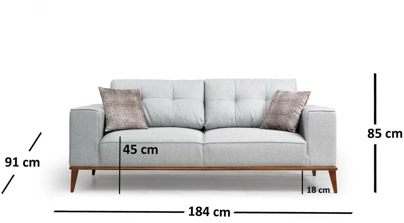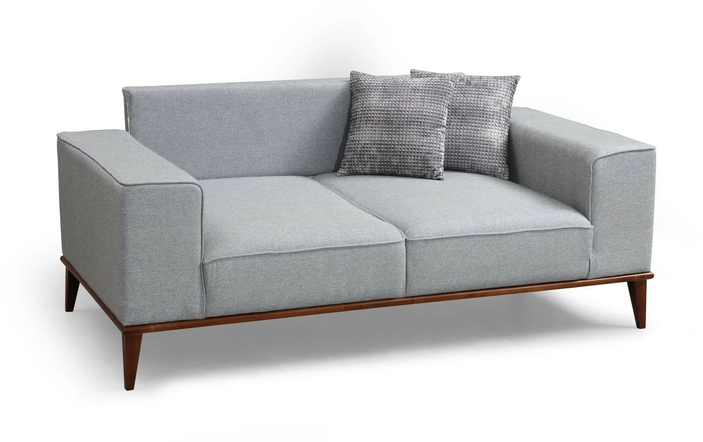 Kahdelle istujalle mitoitettu sohva on samaan aikaan pehmeän muhkea reippaan ryhdikäs. Saksanpähkinänruskeat jalat ovat puuta. Sohvan mukana toimitetaan kaksi koristetyynyä.