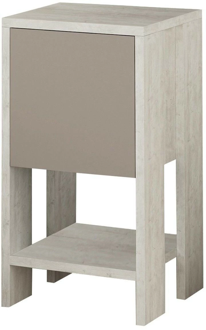 Selkeälinjainen pöytä ilahduttaa ajattomalla muotoilullaan. Kaappiosassa on beige luukkumainen ovi.