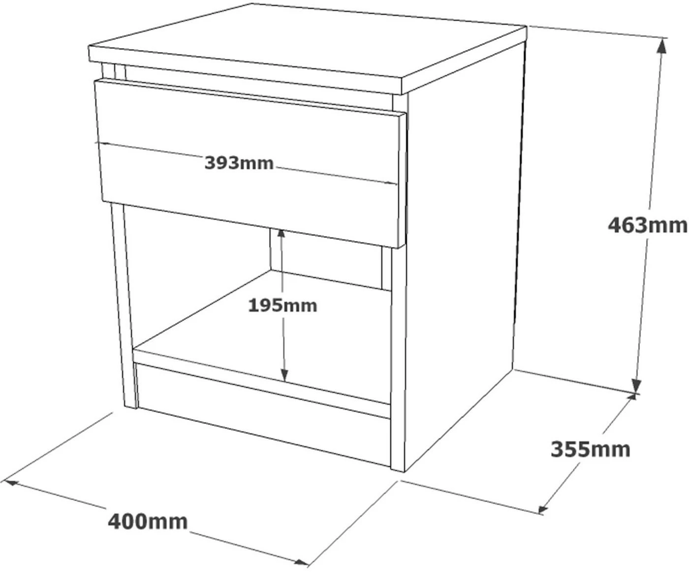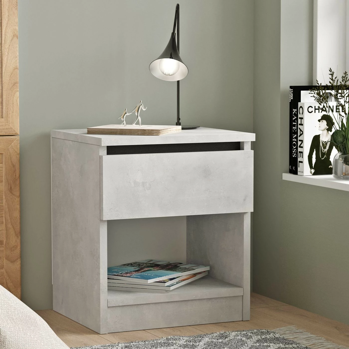 Hopeanharmaa LV26-yöpöytä. Laatikossa ja alatasolla on mukavasti säilytystilaa.