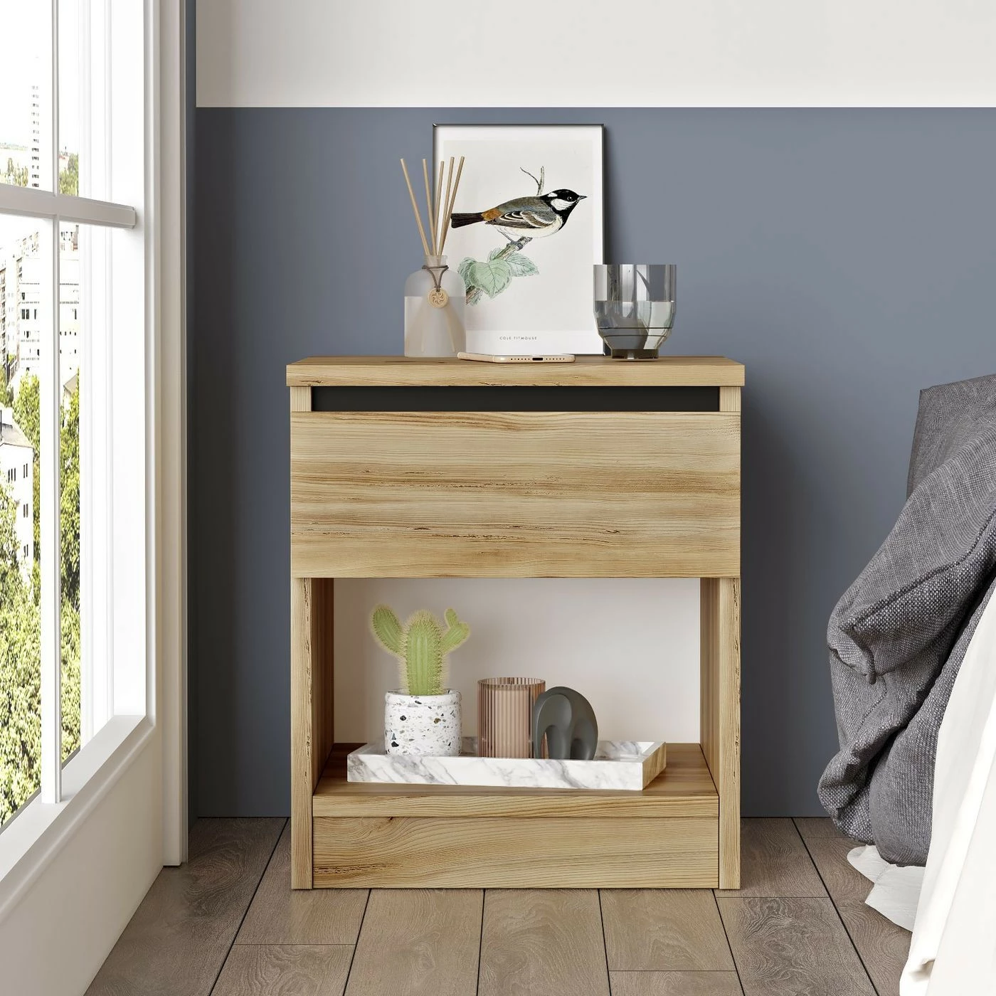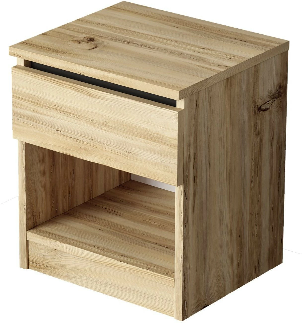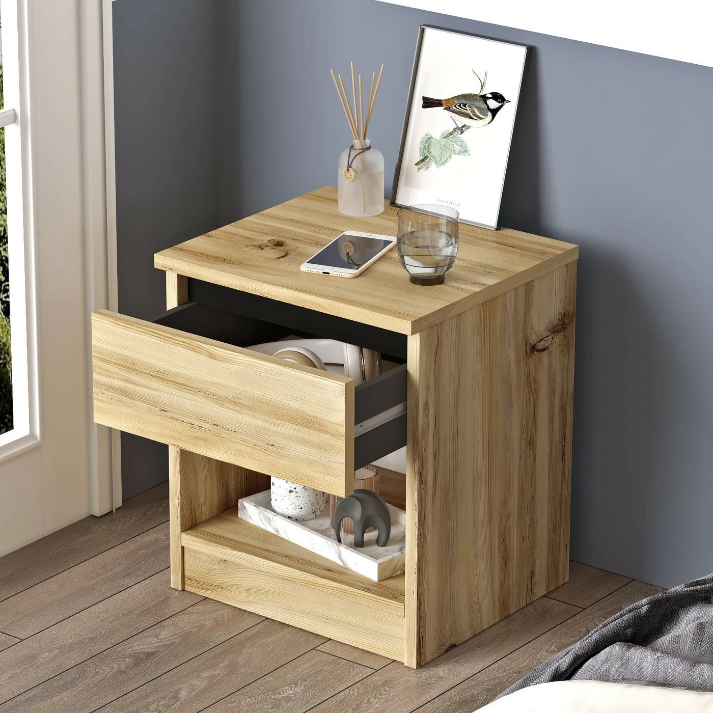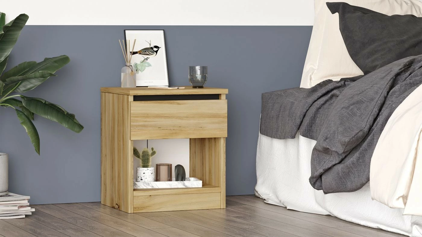 Tammenruskea LV26-yöpöytä. Laatikossa ja alatasolla on mukavasti säilytystilaa.