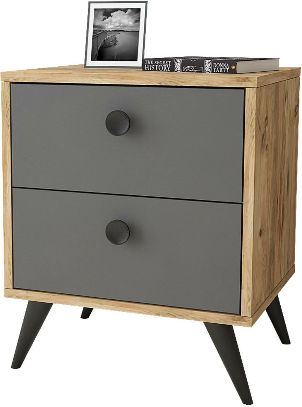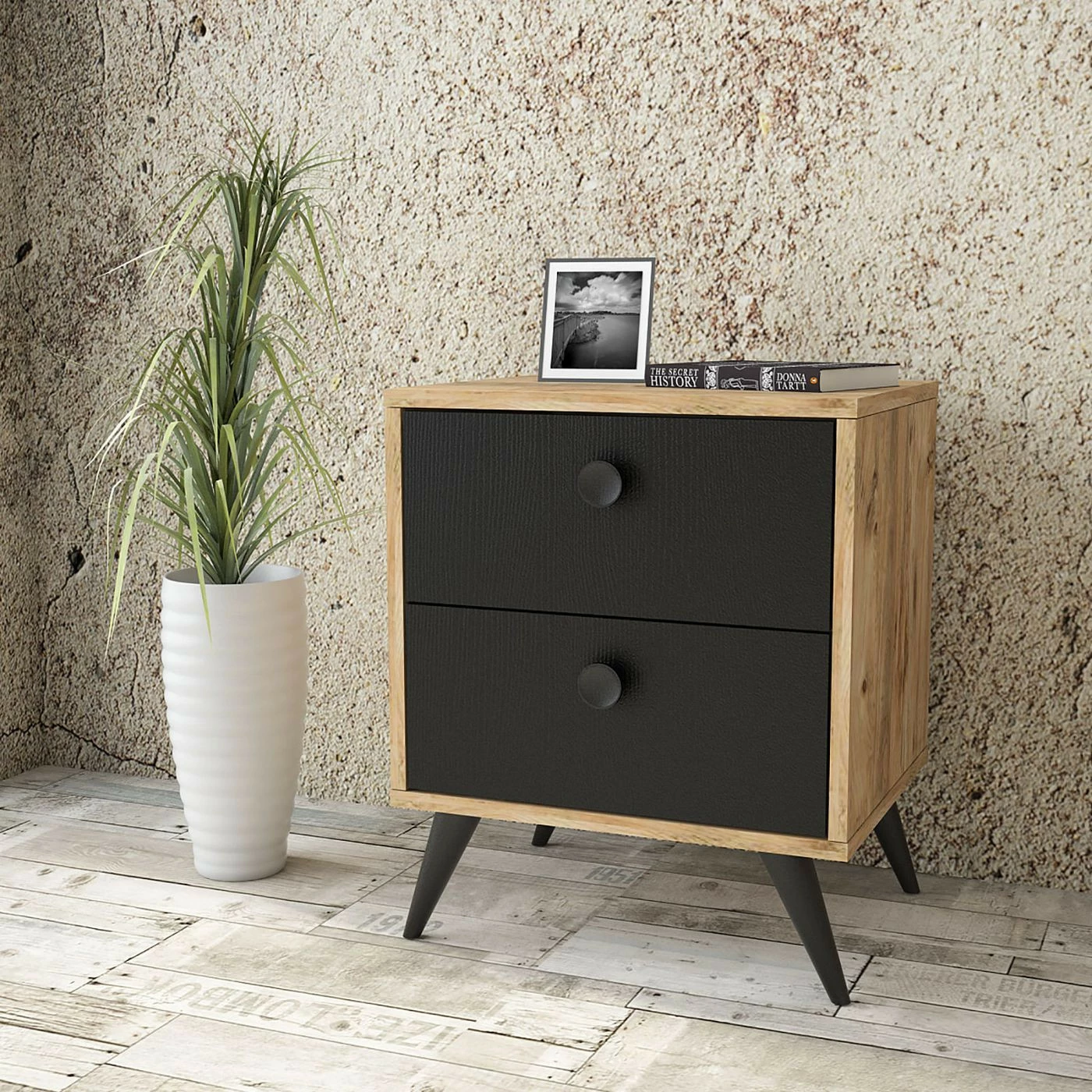 Kaksivärinen VL67-yöpöytä. Tammenruskean pöydän juju on tehosteväriset laatikot. Linjakkaasti muotoillussa yöpöydässä on kaksi laatikkoa.